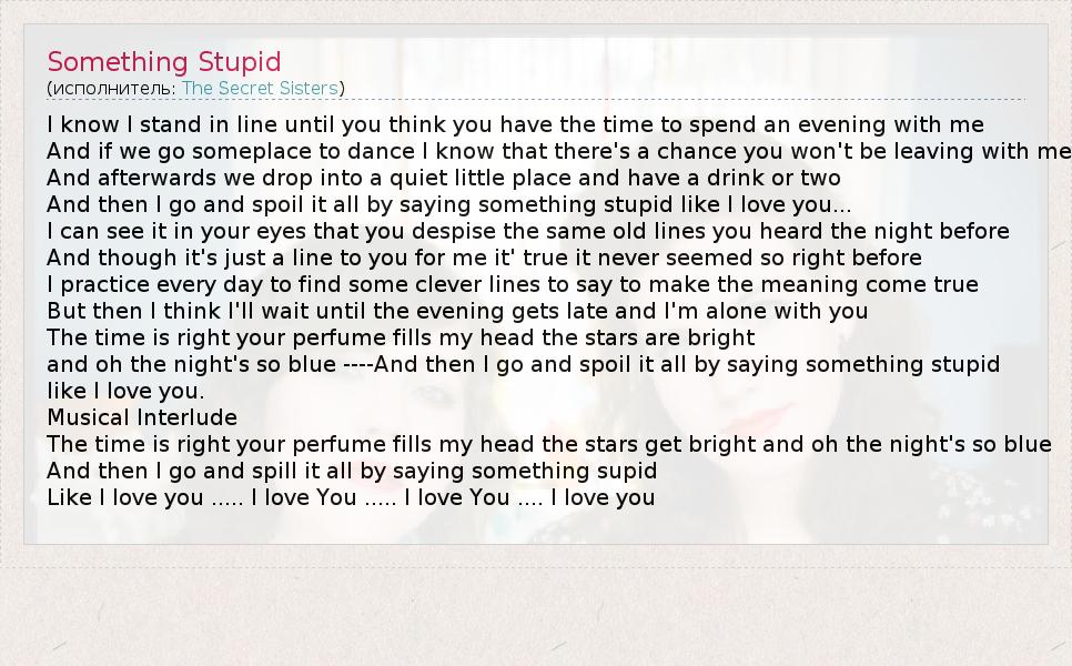 I know I stand in line until you think you have the time to spend an evening with me And if we go someplace to dance I know that there's a chance you won't be leaving with me And afterwards we drop into a quiet little place and have a drink or two And then I go and spoil it all by saying something stupid like I love you... I can see it in your eyes that you despise the same old lines you heard the night before And though it's just a line to you for me it' true it never seemed so right before I practice every day to find some clever lines to say to make the meaning come true But then I think I'll wait until the evening gets late and I'm alone with you The time is right your perfume fills my head the stars are bright and oh the night's so blue ----And then I go and spoil it all by saying something stupid like I love you. Musical Interlude The time is right your perfume fills my head the stars get bright and oh the night's so blue And then I go and spill it all by saying something supid Like I love you ..... I love You ..... I love You .... I love you