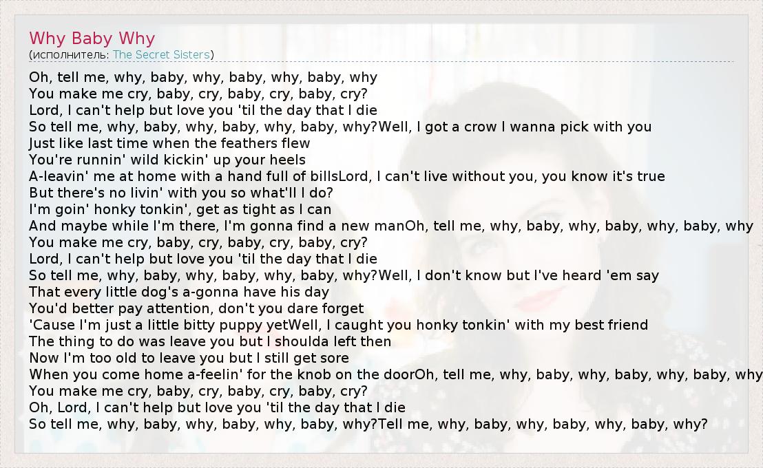 Oh, tell me, why, baby, why, baby, why, baby, why You make me cry, baby, cry, baby, cry, baby, cry? Lord, I can't help but love you 'til the day that I die So tell me, why, baby, why, baby, why, baby, why?Well, I got a crow I wanna pick with you Just like last time when the feathers flew You're runnin' wild kickin' up your heels A-leavin' me at home with a hand full of billsLord, I can't live without you, you know it's true But there's no livin' with you so what'll I do? I'm goin' honky tonkin', get as tight as I can And maybe while I'm there, I'm gonna find a new manOh, tell me, why, baby, why, baby, why, baby, why You make me cry, baby, cry, baby, cry, baby, cry? Lord, I can't help but love you 'til the day that I die So tell me, why, baby, why, baby, why, baby, why?Well, I don't know but I've heard 'em say That every little dog's a-gonna have his day You'd better pay attention, don't you dare forget 'Cause I'm just a little bitty puppy yetWell, I caught you honky tonkin' with my best friend The thing to do was leave you but I shoulda left then Now I'm too old to leave you but I still get sore When you come home a-feelin' for the knob on the doorOh, tell me, why, baby, why, baby, why, baby, why You make me cry, baby, cry, baby, cry, baby, cry? Oh, Lord, I can't help but love you 'til the day that I die So tell me, why, baby, why, baby, why, baby, why?Tell me, why, baby, why, baby, why, baby, why?