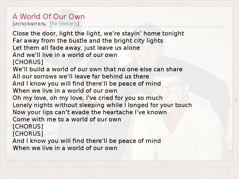 Close the door, light the light, we're stayin' home tonight Far away from the bustle and the bright city lights Let them all fade away, just leave us alone And we'll live in a world of our own [CHORUS] We'll build a world of our own that no one else can share All our sorrows we'll leave far behind us there And I know you will find there'll be peace of mind When we live in a world of our own Oh my love, oh my love, I've cried for you so much Lonely nights without sleeping while I longed for your touch Now your lips can't evade the heartache I've known Come with me to a world of our own [CHORUS] [CHORUS] And I know you will find there'll be peace of mind When we live in a world of our own