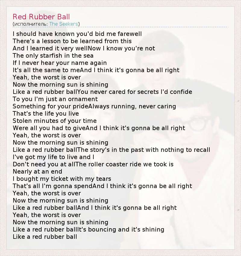 I should have known you'd bid me farewell There's a lesson to be learned from this And I learned it very wellNow I know you're not The only starfish in the sea If I never hear your name again It's all the same to meAnd I think it's gonna be all right Yeah, the worst is over Now the morning sun is shining Like a red rubber ballYou never cared for secrets I'd confide To you I'm just an ornament Something for your prideAlways running, never caring That's the life you live Stolen minutes of your time Were all you had to giveAnd I think it's gonna be all right Yeah, the worst is over Now the morning sun is shining Like a red rubber ballThe story's in the past with nothing to recall I've got my life to live and I Don't need you at allThe roller coaster ride we took is Nearly at an end I bought my ticket with my tears That's all I'm gonna spendAnd I think it's gonna be all right Yeah, the worst is over Now the morning sun is shining Like a red rubber ballAnd I think it's gonna be all right Yeah, the worst is over Now the morning sun is shining Like a red rubber ballIt's bouncing and it's shining Like a red rubber ball
