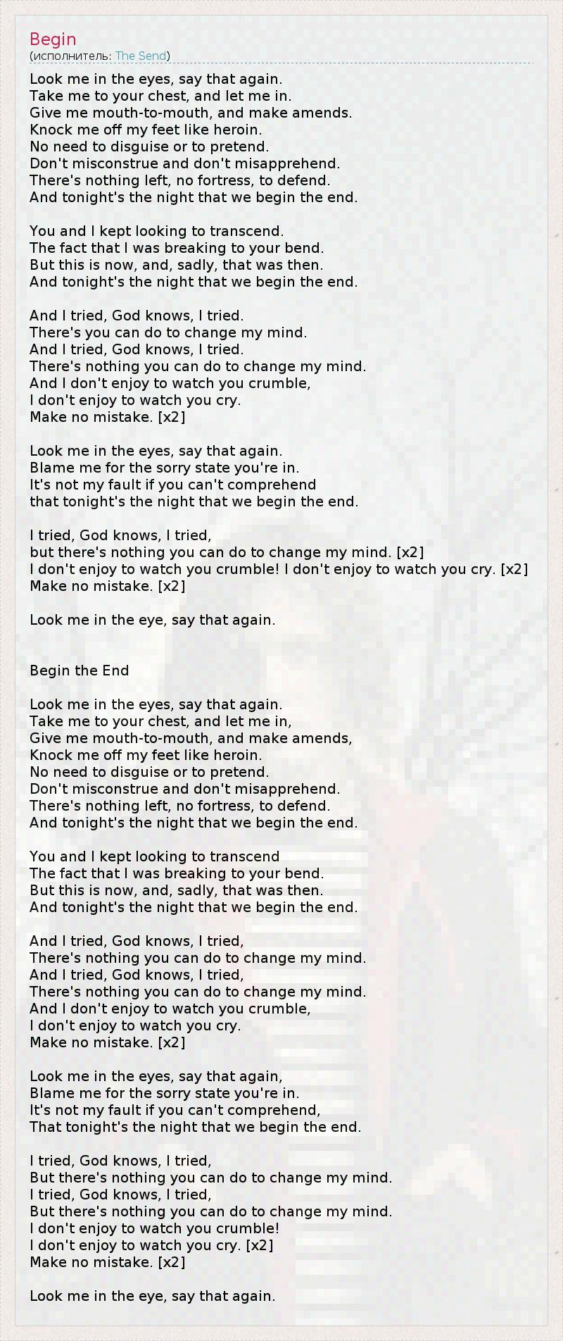Посмотри в мои глаза, скажи это снова. Прижми меня к своей груди и впусти меня. Сделай мне искусственное дыхание и внеси поправки. Сбей меня с ног, словно героин. Мне не нужна маскировка или притворство. Не пойми меня превратно или неправильно. Здесь нет ничего лишнего, нет крепости, которая нуждается в защите. И сегодня ночью мы положим этому конец. Мы с тобой должны перешагнуть через Тот факт, что я перегибал палку. Но сейчас - это сейчас, и, к сожалению, такое случалось. И сегодня ночью мы положим этому конец. И я пытался, Бог свидетель, я пытался, Но ты никак не можешь изменить мой разум. [2x] И я пытался, Бог свидетель, я пытался, Мне не доставляет удовольствия смотреть на то, как ты рассыпаешься. Мне не доставляет удовольствия смотреть на то, как ты плачешь. [2x] Можешь не сомневаться [2x] Посмотри в мои глаза, скажи это снова. Обвини меня в своем расстройстве, Не моя вина в том, что ты не можешь осмыслить, Что сегодня ночью мы положим этому конец. И я пытался, Бог свидетель, я пытался, Но ты никак не можешь изменить мой разум. [2x] Мне не доставляет удовольствия смотреть на то, как ты рассыпаешься. Мне не доставляет удовольствия смотреть на то, как ты плачешь. [2x] Можешь не сомневаться [2x] Посмотри в мои глаза, скажи это снова. Начало конца (перевод Элеонора из Санкт-Петербурга) Посмотри мне в глаза, повтори это вновь. Прижми меня к груди и впусти меня, Сделай мне искусственное дыхание, загладь свою вину, Выруби меня, как героин. Нет нужды скрываться или притворяться. Истолкуй это верно, не пойми превратно. Ничего не осталось, нет крепости, которую нужно защищать, И эта ночь – начало нашего конца... Мы всё время пытались переступить Через тот факт, что я ломался, приспосабливаясь к тебе. Но это сейчас, а прошлое, к сожалению, уже не вернёшь. И сегодняшняя ночь – начало нашего конца... И я пытался, видит Бог, я пытался, Ты ничем не сможешь меня переубедить. И я пытался, видит Бог, я пытался, Ты ничем не сможешь меня переубедить. Мне больно видеть, как ты гибнешь, Мне неприятно видеть тебя в слезах. Не соверши ошибки. [x2] Посмотри мне в глаза, повтори это вновь, Обвиняй меня в том, что ты в таком плачевном состоянии. Я не виноват в том, что ты никак не можешь понять, Что эта ночь – начало нашего конца... И я пытался, видит Бог, я пытался, Ты ничем не сможешь меня переубедить. И я пытался, видит Бог, я пытался, Ты ничем не сможешь меня переубедить. Мне больно видеть, как ты гибнешь, Мне неприятно видеть тебя в слезах.[x2] Не сделай ошибки. [x2] Посмотри мне в глаза, повтори это вновь.
