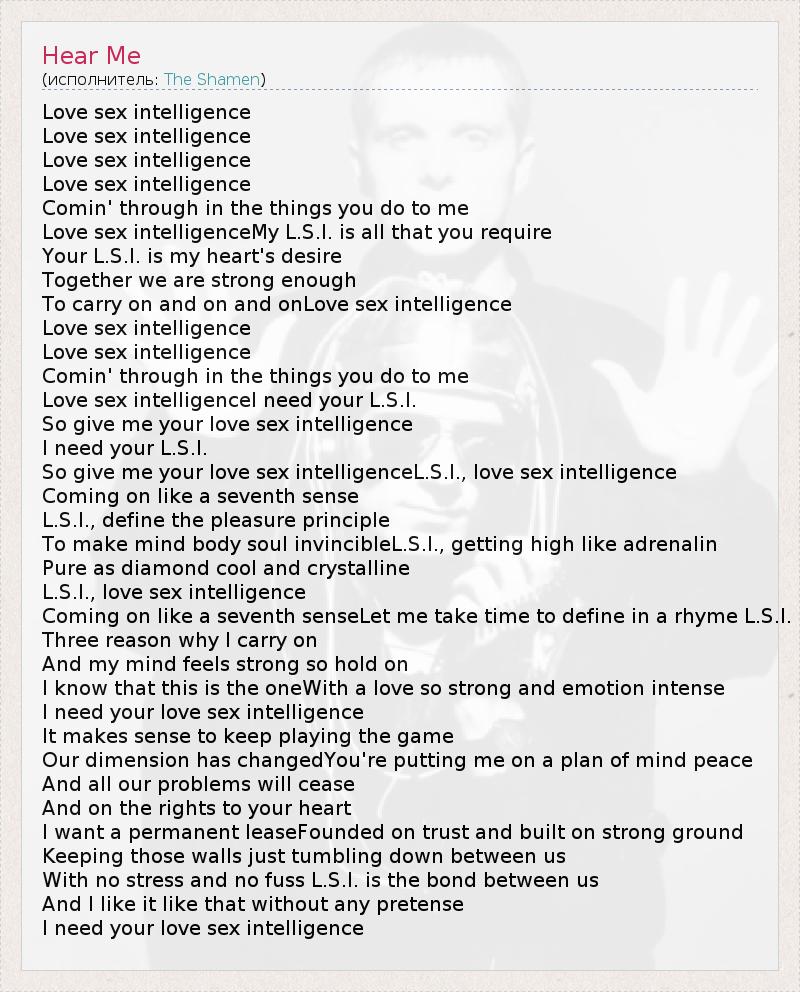 Love sex intelligence Love sex intelligence Love sex intelligence Love sex intelligence Comin' through in the things you do to me Love sex intelligenceMy L.S.I. is all that you require Your L.S.I. is my heart's desire Together we are strong enough To carry on and on and onLove sex intelligence Love sex intelligence Love sex intelligence Comin' through in the things you do to me Love sex intelligenceI need your L.S.I. So give me your love sex intelligence I need your L.S.I. So give me your love sex intelligenceL.S.I., love sex intelligence Coming on like a seventh sense L.S.I., define the pleasure principle To make mind body soul invincibleL.S.I., getting high like adrenalin Pure as diamond cool and crystalline L.S.I., love sex intelligence Coming on like a seventh senseLet me take time to define in a rhyme L.S.I. Three reason why I carry on And my mind feels strong so hold on I know that this is the oneWith a love so strong and emotion intense I need your love sex intelligence It makes sense to keep playing the game Our dimension has changedYou're putting me on a plan of mind peace And all our problems will cease And on the rights to your heart I want a permanent leaseFounded on trust and built on strong ground Keeping those walls just tumbling down between us With no stress and no fuss L.S.I. is the bond between us And I like it like that without any pretense I need your love sex intelligence
