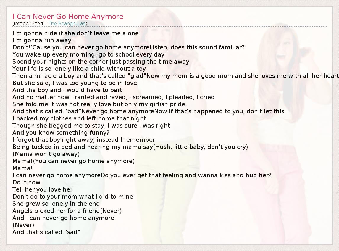 I'm gonna hide if she don't leave me alone I'm gonna run away Don't!'Cause you can never go home anymoreListen, does this sound familiar? You wake up every morning, go to school every day Spend your nights on the corner just passing the time away Your life is so lonely like a child without a toy Then a miracle-a boy and that's called "glad"Now my mom is a good mom and she loves me with all her heart But she said, I was too young to be in love And the boy and I would have to part And no matter how I ranted and raved, I screamed, I pleaded, I cried She told me it was not really love but only my girlish pride And that's called "bad"Never go home anymoreNow if that's happened to you, don't let this I packed my clothes and left home that night Though she begged me to stay, I was sure I was right And you know something funny? I forgot that boy right away, instead I remember Being tucked in bed and hearing my mama say(Hush, little baby, don't you cry) (Mama won't go away) Mama!(You can never go home anymore) Mama! I can never go home anymoreDo you ever get that feeling and wanna kiss and hug her? Do it now Tell her you love her Don't do to your mom what I did to mine She grew so lonely in the end Angels picked her for a friend(Never) And I can never go home anymore (Never) And that's called "sad"