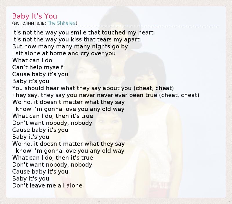 It's not the way you smile that touched my heart It's not the way you kiss that tears my apart But how many many many nights go by I sit alone at home and cry over you What can I do Can't help myself Cause baby it's you Baby it's you You should hear what they say about you (cheat, cheat) They say, they say you never never ever been true (cheat, cheat) Wo ho, it doesn't matter what they say I know I'm gonna love you any old way What can I do, then it's true Don't want nobody, nobody Cause baby it's you Baby it's you Wo ho, it doesn't matter what they say I know I'm gonna love you any old way What can I do, then it's true Don't want nobody, nobody Cause baby it's you Baby it's you Don't leave me all alone