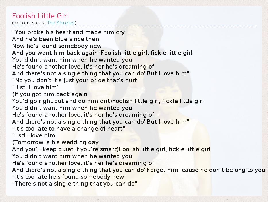 "You broke his heart and made him cry And he's been blue since then Now he's found somebody new And you want him back again"Foolish little girl, fickle little girl You didn't want him when he wanted you He's found another love, it's her he's dreaming of And there's not a single thing that you can do"But I love him" "No you don't it's just your pride that's hurt" " I still love him" (If you got him back again You'd go right out and do him dirt)Foolish little girl, fickle little girl You didn't want him when he wanted you He's found another love, it's her he's dreaming of And there's not a single thing that you can do"But I love him" "It's too late to have a change of heart" "I still love him" (Tomorrow is his wedding day And you'll keep quiet if you're smart)Foolish little girl, fickle little girl You didn't want him when he wanted you He's found another love, it's her he's dreaming of And there's not a single thing that you can do"Forget him 'cause he don't belong to you" "It's too late he's found somebody new" "There's not a single thing that you can do"