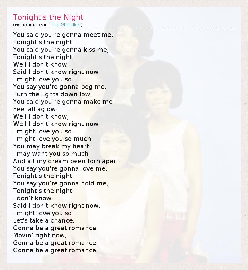 You said you're gonna meet me, Tonight's the night. You said you're gonna kiss me, Tonight's the night, Well I don't know, Said I don't know right now I might love you so. You say you're gonna beg me, Turn the lights down low You said you're gonna make me Feel all aglow. Well I don't know, Well I don't know right now I might love you so. I might love you so much. You may break my heart. I may want you so much And all my dream been torn apart. You say you're gonna love me, Tonight's the night. You say you're gonna hold me, Tonight's the night. I don't know. Said I don't know right now. I might love you so. Let's take a chance. Gonna be a great romance Movin' right now, Gonna be a great romance Gonna be a great romance