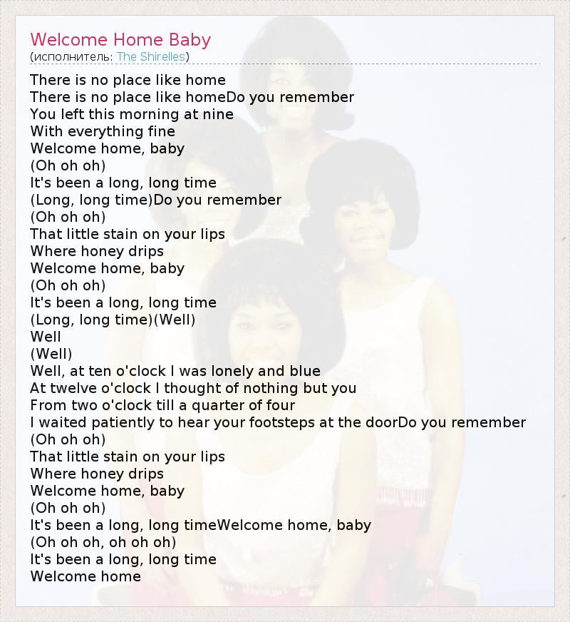 There is no place like home There is no place like homeDo you remember You left this morning at nine With everything fine Welcome home, baby (Oh oh oh) It's been a long, long time (Long, long time)Do you remember (Oh oh oh) That little stain on your lips Where honey drips Welcome home, baby (Oh oh oh) It's been a long, long time (Long, long time)(Well) Well (Well) Well, at ten o'clock I was lonely and blue At twelve o'clock I thought of nothing but you From two o'clock till a quarter of four I waited patiently to hear your footsteps at the doorDo you remember (Oh oh oh) That little stain on your lips Where honey drips Welcome home, baby (Oh oh oh) It's been a long, long timeWelcome home, baby (Oh oh oh, oh oh oh) It's been a long, long time Welcome home