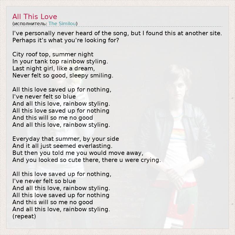 I've personally never heard of the song, but I found this at another site. Perhaps it's what you're looking for? City roof top, summer night In your tank top rainbow styling. Last night girl, like a dream, Never felt so good, sleepy smiling. All this love saved up for nothing, I've never felt so blue And all this love, rainbow styling. All this love saved up for nothing And this will so me no good And all this love, rainbow styling. Everyday that summer, by your side And it all just seemed everlasting. But then you told me you would move away, And you looked so cute there, there u were crying. All this love saved up for nothing, I've never felt so blue And all this love, rainbow styling. All this love saved up for nothing And this will so me no good And all this love, rainbow styling. (repeat)