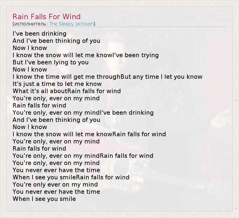 I've been drinking And I've been thinking of you Now I know I know the snow will let me knowI've been trying But I've been lying to you Now I know I know the time will get me throughBut any time I let you know It's just a time to let me know What it's all aboutRain falls for wind You're only, ever on my mind Rain falls for wind You're only, ever on my mindI've been drinking And I've been thinking of you Now I know I know the snow will let me knowRain falls for wind You're only, ever on my mind Rain falls for wind You're only, ever on my mindRain falls for wind You're only, ever on my mind You never ever have the time When I see you smileRain falls for wind You're only ever on my mind You never ever have the time When I see you smile