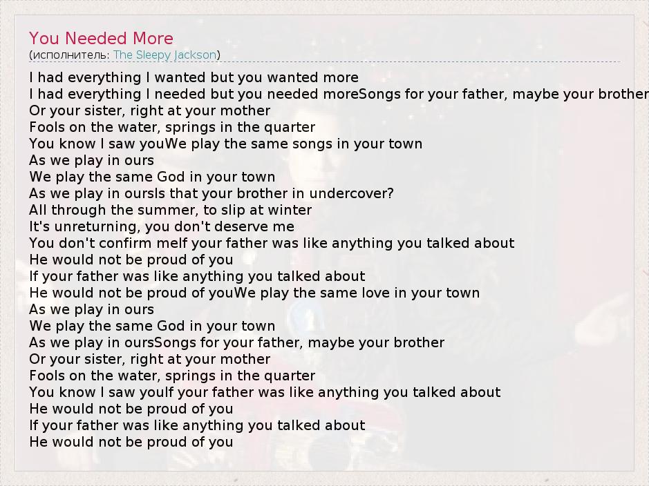 I had everything I wanted but you wanted more I had everything I needed but you needed moreSongs for your father, maybe your brother Or your sister, right at your mother Fools on the water, springs in the quarter You know I saw youWe play the same songs in your town As we play in ours We play the same God in your town As we play in oursIs that your brother in undercover? All through the summer, to slip at winter It's unreturning, you don't deserve me You don't confirm meIf your father was like anything you talked about He would not be proud of you If your father was like anything you talked about He would not be proud of youWe play the same love in your town As we play in ours We play the same God in your town As we play in oursSongs for your father, maybe your brother Or your sister, right at your mother Fools on the water, springs in the quarter You know I saw youIf your father was like anything you talked about He would not be proud of you If your father was like anything you talked about He would not be proud of you