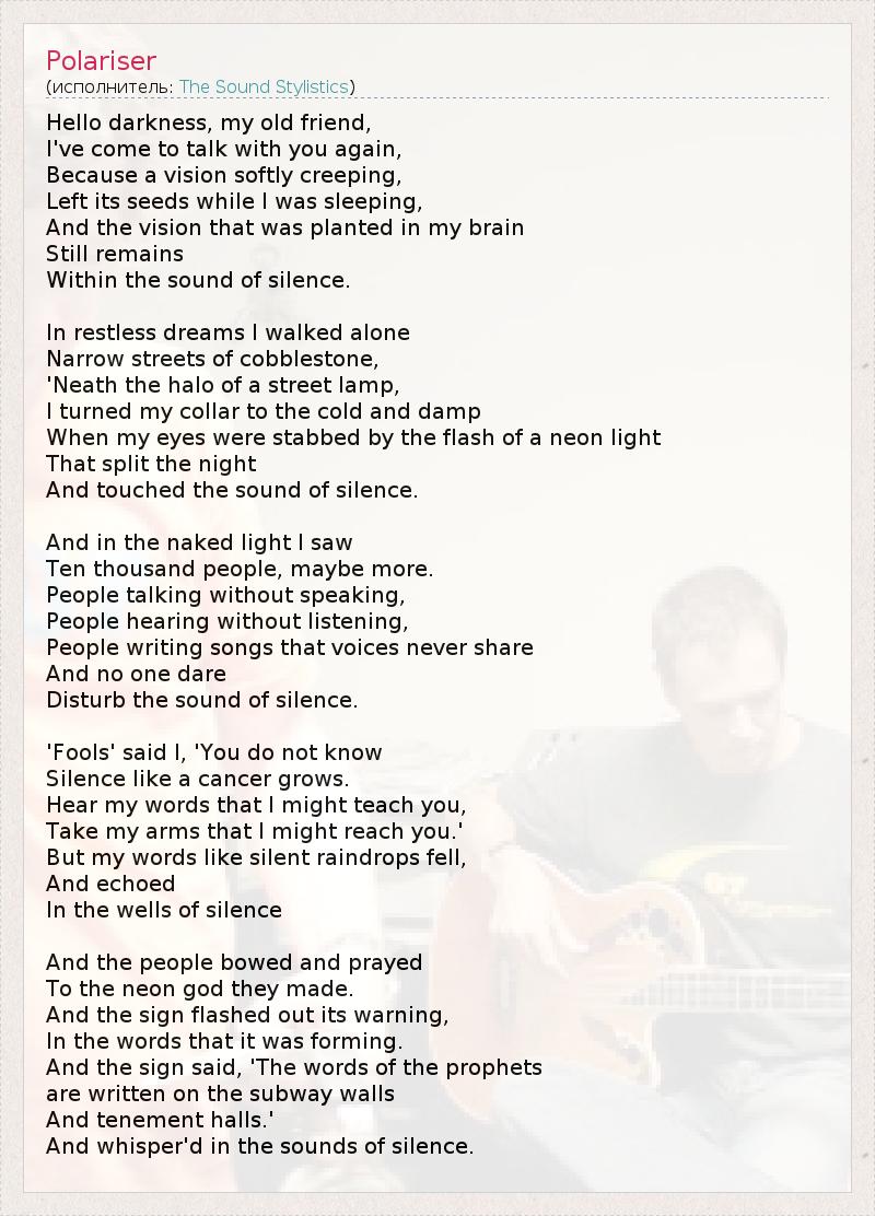 Hello darkness, my old friend, I've come to talk with you again, Because a vision softly creeping, Left its seeds while I was sleeping, And the vision that was planted in my brain Still remains Within the sound of silence. In restless dreams I walked alone Narrow streets of cobblestone, 'Neath the halo of a street lamp, I turned my collar to the cold and damp When my eyes were stabbed by the flash of a neon light That split the night And touched the sound of silence. And in the naked light I saw Ten thousand people, maybe more. People talking without speaking, People hearing without listening, People writing songs that voices never share And no one dare Disturb the sound of silence. 'Fools' said I, 'You do not know Silence like a cancer grows. Hear my words that I might teach you, Take my arms that I might reach you.' But my words like silent raindrops fell, And echoed In the wells of silence And the people bowed and prayed To the neon god they made. And the sign flashed out its warning, In the words that it was forming. And the sign said, 'The words of the prophets are written on the subway walls And tenement halls.' And whisper'd in the sounds of silence.
