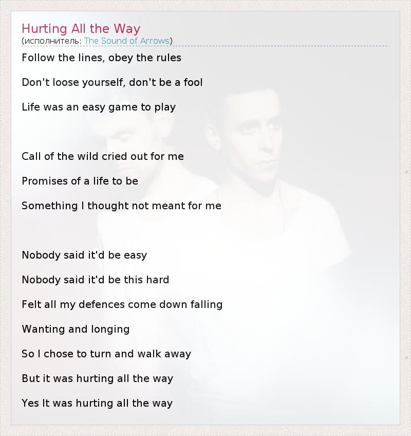 Follow the lines, obey the rules Don't loose yourself, don't be a fool Life was an easy game to play Call of the wild cried out for me Promises of a life to be Something I thought not meant for me Nobody said it'd be easy Nobody said it'd be this hard Felt all my defences come down falling Wanting and longing So I chose to turn and walk away But it was hurting all the way Yes It was hurting all the way