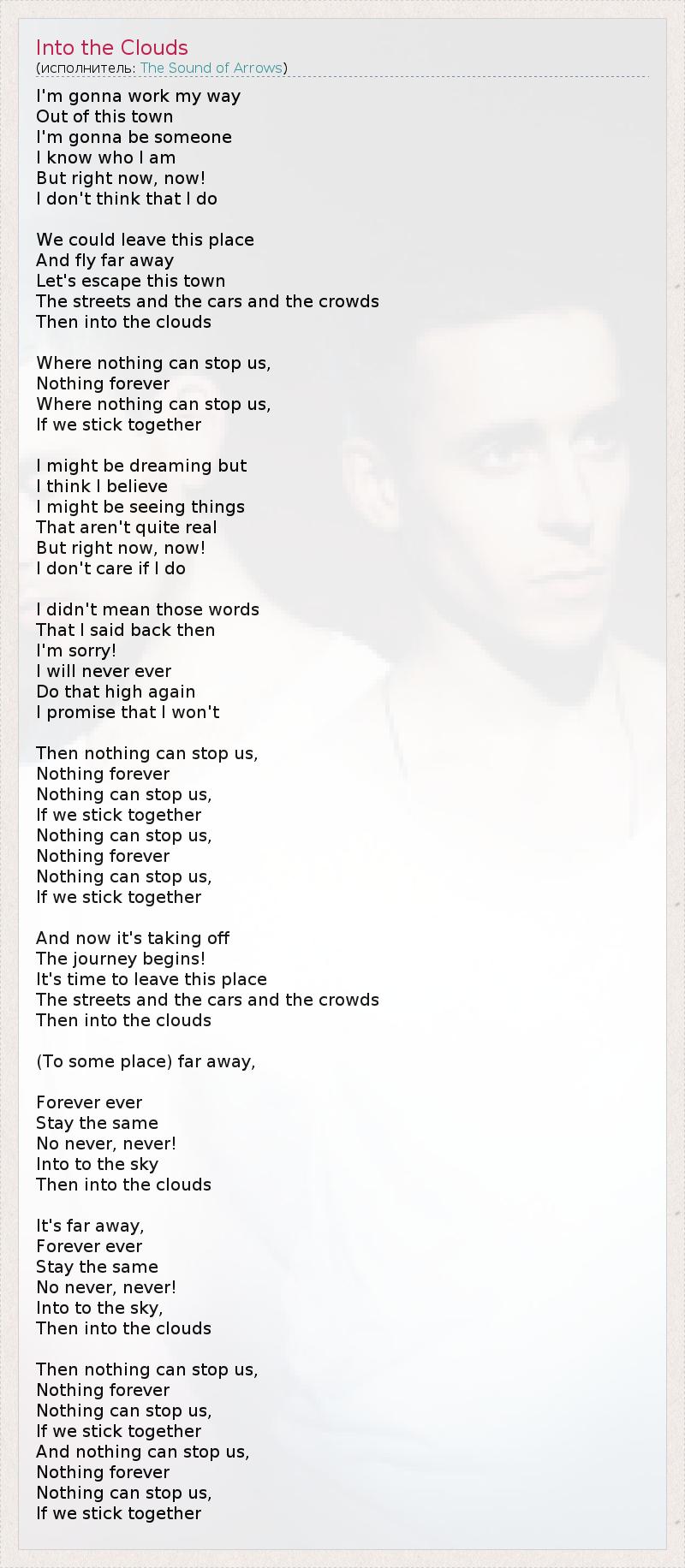 I'm gonna work my way Out of this town I'm gonna be someone I know who I am But right now, now! I don't think that I do We could leave this place And fly far away Let's escape this town The streets and the cars and the crowds Then into the clouds Where nothing can stop us, Nothing forever Where nothing can stop us, If we stick together I might be dreaming but I think I believe I might be seeing things That aren't quite real But right now, now! I don't care if I do I didn't mean those words That I said back then I'm sorry! I will never ever Do that high again I promise that I won't Then nothing can stop us, Nothing forever Nothing can stop us, If we stick together Nothing can stop us, Nothing forever Nothing can stop us, If we stick together And now it's taking off The journey begins! It's time to leave this place The streets and the cars and the crowds Then into the clouds (To some place) far away, Forever ever Stay the same No never, never! Into to the sky Then into the clouds It's far away, Forever ever Stay the same No never, never! Into to the sky, Then into the clouds Then nothing can stop us, Nothing forever Nothing can stop us, If we stick together And nothing can stop us, Nothing forever Nothing can stop us, If we stick together