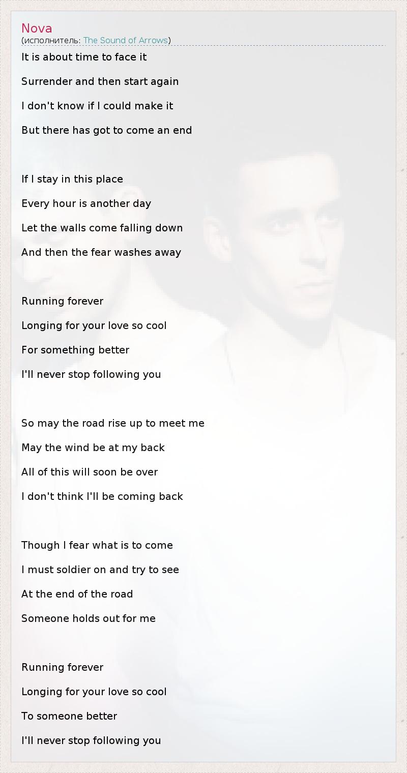 It is about time to face it Surrender and then start again I don't know if I could make it But there has got to come an end If I stay in this place Every hour is another day Let the walls come falling down And then the fear washes away Running forever Longing for your love so cool For something better I'll never stop following you So may the road rise up to meet me May the wind be at my back All of this will soon be over I don't think I'll be coming back Though I fear what is to come I must soldier on and try to see At the end of the road Someone holds out for me Running forever Longing for your love so cool To someone better I'll never stop following you