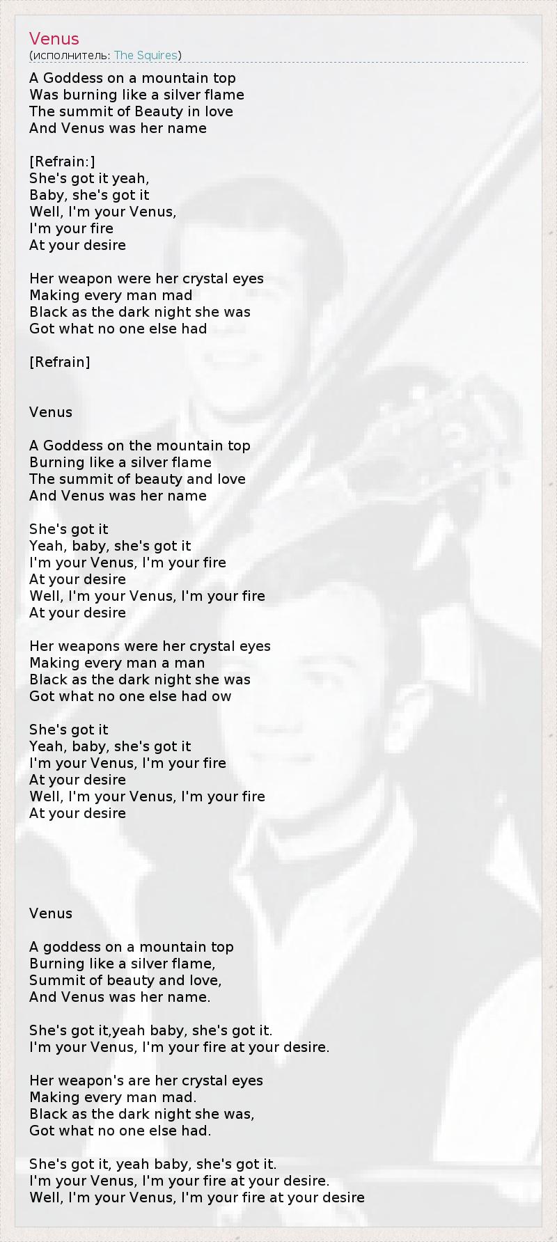 A Goddess on a mountain top Was burning like a silver flame The summit of Beauty in love And Venus was her name [Refrain:] She's got it yeah, Baby, she's got it Well, I'm your Venus, I'm your fire At your desire Her weapon were her crystal eyes Making every man mad Black as the dark night she was Got what no one else had [Refrain] Venus A Goddess on the mountain top Burning like a silver flame The summit of beauty and love And Venus was her name She's got it Yeah, baby, she's got it I'm your Venus, I'm your fire At your desire Well, I'm your Venus, I'm your fire At your desire Her weapons were her crystal eyes Making every man a man Black as the dark night she was Got what no one else had ow She's got it Yeah, baby, she's got it I'm your Venus, I'm your fire At your desire Well, I'm your Venus, I'm your fire At your desire Venus A goddess on a mountain top Burning like a silver flame, Summit of beauty and love, And Venus was her name. She's got it,yeah baby, she's got it. I'm your Venus, I'm your fire at your desire. Her weapon's are her crystal eyes Making every man mad. Black as the dark night she was, Got what no one else had. She's got it, yeah baby, she's got it. I'm your Venus, I'm your fire at your desire. Well, I'm your Venus, I'm your fire at your desire