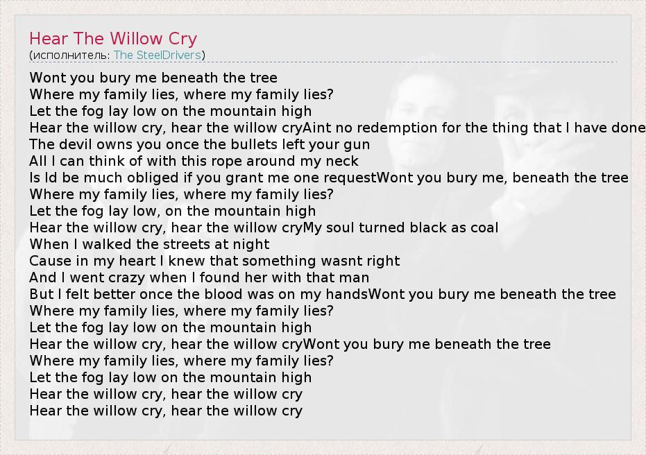 Hear the willow cry, hear the willow cryWont you bury me beneath the tree