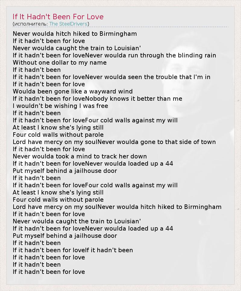 Never woulda hitch hiked to Birmingham If it hadn't been for love Never woulda caught the train to Louisian' If it hadn't been for loveNever woulda run through the blinding rain Without one dollar to my name If it hadn't been If it hadn't been for loveNever woulda seen the trouble that I'm in If it hadn't been for love Woulda been gone like a wayward wind If it hadn't been for loveNobody knows it better than me I wouldn't be wishing I was free If it hadn't been If it hadn't been for loveFour cold walls against my will At least I know she's lying still Four cold walls without parole Lord have mercy on my soulNever woulda gone to that side of town If it hadn't been for love Never woulda took a mind to track her down If it hadn't been for loveNever woulda loaded up a 44 Put myself behind a jailhouse door If it hadn't been If it hadn't been for loveFour cold walls against my will At least I know she's lying still Four cold walls without parole Lord have mercy on my soulNever woulda hitch hiked to Birmingham If it hadn't been for love Never woulda caught the train to Louisian' If it hadn't been for loveNever woulda loaded up a 44 Put myself behind a jailhouse door If it hadn't been If it hadn't been for loveIf it hadn't been If it hadn't been for love If it hadn't been If it hadn't been for love