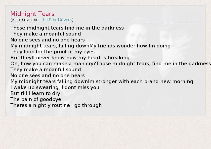 Those midnight tears find me in the darkness They make a moanful sound No one sees and no one hears My midnight tears, falling downMy friends wonder how Im doing They look for the proof in my eyes But theyll never know how my heart is breaking Oh, how you can make a man cry?Those midnight tears, find me in the darkness They make a moanful sound No one sees and no one hears My midnight tears falling downIm stronger with each brand new morning I wake up swearing, I dont miss you But till I learn to dry The pain of goodbye Theres a nightly routine I go through