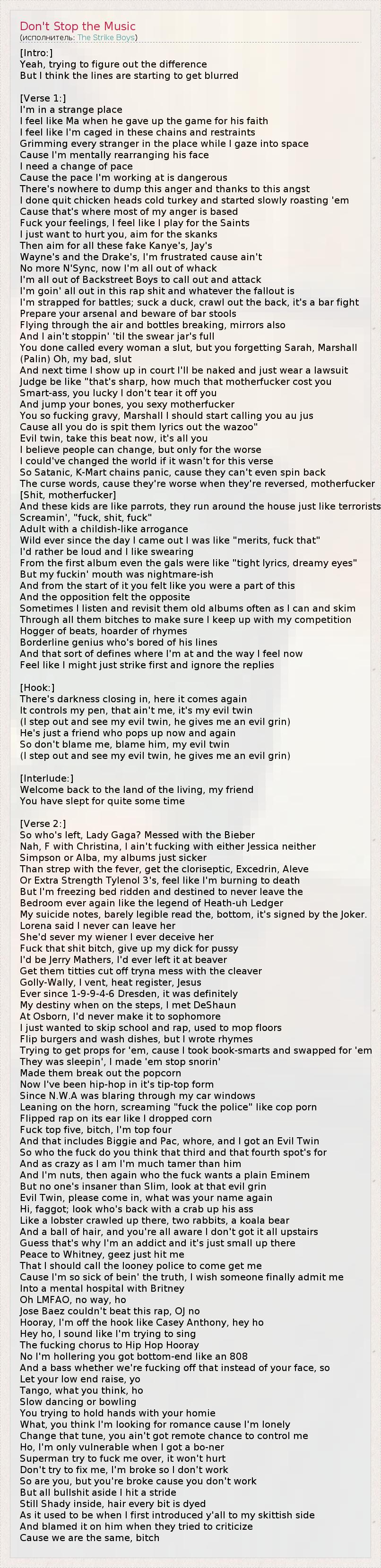 [Intro:] Yeah, trying to figure out the difference But I think the lines are starting to get blurred [Verse 1:] I'm in a strange place I feel like Ma when he gave up the game for his faith I feel like I'm caged in these chains and restraints Grimming every stranger in the place while I gaze into space Cause I'm mentally rearranging his face I need a change of pace Cause the pace I'm working at is dangerous There's nowhere to dump this anger and thanks to this angst I done quit chicken heads cold turkey and started slowly roasting 'em Cause that's where most of my anger is based Fuck your feelings, I feel like I play for the Saints I just want to hurt you, aim for the skanks Then aim for all these fake Kanye's, Jay's Wayne's and the Drake's, I'm frustrated cause ain't No more N'Sync, now I'm all out of whack I'm all out of Backstreet Boys to call out and attack I'm goin' all out in this rap shit and whatever the fallout is I'm strapped for battles; suck a duck, crawl out the back, it's a bar fight Prepare your arsenal and beware of bar stools Flying through the air and bottles breaking, mirrors also And I ain't stoppin' 'til the swear jar's full You done called every woman a slut, but you forgetting Sarah, Marshall (Palin) Oh, my bad, slut And next time I show up in court I'll be naked and just wear a lawsuit Judge be like "that's sharp, how much that motherfucker cost you Smart-ass, you lucky I don't tear it off you And jump your bones, you sexy motherfucker You so fucking gravy, Marshall I should start calling you au jus Cause all you do is spit them lyrics out the wazoo" Evil twin, take this beat now, it's all you I believe people can change, but only for the worse I could've changed the world if it wasn't for this verse So Satanic, K-Mart chains panic, cause they can't even spin back The curse words, cause they're worse when they're reversed, motherfucker [Shit, motherfucker] And these kids are like parrots, they run around the house just like terrorists Screamin', "fuck, shit, fuck" Adult with a childish-like arrogance Wild ever since the day I came out I was like "merits, fuck that" I'd rather be loud and I like swearing From the first album even the gals were like "tight lyrics, dreamy eyes" But my fuckin' mouth was nightmare-ish And from the start of it you felt like you were a part of this And the opposition felt the opposite Sometimes I listen and revisit them old albums often as I can and skim Through all them bitches to make sure I keep up with my competition Hogger of beats, hoarder of rhymes Borderline genius who's bored of his lines And that sort of defines where I'm at and the way I feel now Feel like I might just strike first and ignore the replies [Hook:] There's darkness closing in, here it comes again It controls my pen, that ain't me, it's my evil twin (I step out and see my evil twin, he gives me an evil grin) He's just a friend who pops up now and again So don't blame me, blame him, my evil twin (I step out and see my evil twin, he gives me an evil grin) [Interlude:] Welcome back to the land of the living, my friend You have slept for quite some time [Verse 2:] So who's left, Lady Gaga? Messed with the Bieber Nah, F with Christina, I ain't fucking with either Jessica neither Simpson or Alba, my albums just sicker Than strep with the fever, get the cloriseptic, Excedrin, Aleve Or Extra Strength Tylenol 3's, feel like I'm burning to death But I'm freezing bed ridden and destined to never leave the Bedroom ever again like the legend of Heath-uh Ledger My suicide notes, barely legible read the, bottom, it's signed by the Joker. Lorena said I never can leave her She'd sever my wiener I ever deceive her Fuck that shit bitch, give up my dick for pussy I'd be Jerry Mathers, I'd ever left it at beaver Get them titties cut off tryna mess with the cleaver Golly-Wally, I vent, heat register, Jesus Ever since 1-9-9-4-6 Dresden, it was definitely My destiny when on the steps, I met DeShaun At Osborn, I'd never make it to sophomore I just wanted to skip school and rap, used to mop floors Flip burgers and wash dishes, but I wrote rhymes Trying to get props for 'em, cause I took book-smarts and swapped for 'em They was sleepin', I made 'em stop snorin' Made them break out the popcorn Now I've been hip-hop in it's tip-top form Since N.W.A was blaring through my car windows Leaning on the horn, screaming "fuck the police" like cop porn Flipped rap on its ear like I dropped corn Fuck top five, bitch, I'm top four And that includes Biggie and Pac, whore, and I got an Evil Twin So who the fuck do you think that third and that fourth spot's for And as crazy as I am I'm much tamer than him And I'm nuts, then again who the fuck wants a plain Eminem But no one's insaner than Slim, look at that evil grin Evil Twin, please come in, what was your name again Hi, faggot; look who's back with a crab up his ass Like a lobster crawled up there, two rabbits, a koala bear And a ball of hair, and you're all aware I don't got it all upstairs Guess that's why I'm an addict and it's just small up there Peace to Whitney, geez just hit me That I should call the looney police to come get me Cause I'm so sick of bein' the truth, I wish someone finally admit me Into a mental hospital with Britney Oh LMFAO, no way, ho Jose Baez couldn't beat this rap, OJ no Hooray, I'm off the hook like Casey Anthony, hey ho Hey ho, I sound like I'm trying to sing The fucking chorus to Hip Hop Hooray No I'm hollering you got bottom-end like an 808 And a bass whether we're fucking off that instead of your face, so Let your low end raise, yo Tango, what you think, ho Slow dancing or bowling You trying to hold hands with your homie What, you think I'm looking for romance cause I'm lonely Change that tune, you ain't got remote chance to control me Ho, I'm only vulnerable when I got a bo-ner Superman try to fuck me over, it won't hurt Don't try to fix me, I'm broke so I don't work So are you, but you're broke cause you don't work Bu