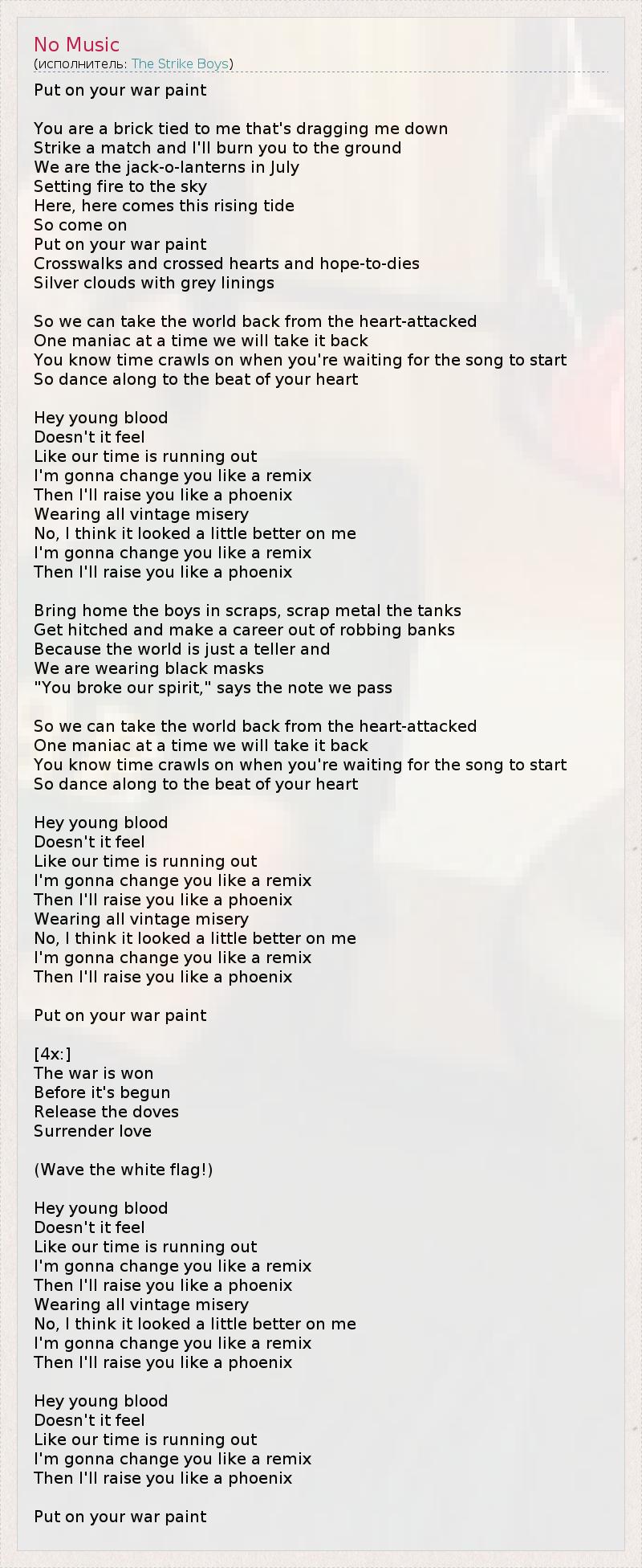 Put on your war paint You are a brick tied to me that's dragging me down Strike a match and I'll burn you to the ground We are the jack-o-lanterns in July Setting fire to the sky Here, here comes this rising tide So come on Put on your war paint Crosswalks and crossed hearts and hope-to-dies Silver clouds with grey linings So we can take the world back from the heart-attacked One maniac at a time we will take it back You know time crawls on when you're waiting for the song to start So dance along to the beat of your heart Hey young blood Doesn't it feel Like our time is running out I'm gonna change you like a remix Then I'll raise you like a phoenix Wearing all vintage misery No, I think it looked a little better on me I'm gonna change you like a remix Then I'll raise you like a phoenix Bring home the boys in scraps, scrap metal the tanks Get hitched and make a career out of robbing banks Because the world is just a teller and We are wearing black masks "You broke our spirit," says the note we pass So we can take the world back from the heart-attacked One maniac at a time we will take it back You know time crawls on when you're waiting for the song to start So dance along to the beat of your heart Hey young blood Doesn't it feel Like our time is running out I'm gonna change you like a remix Then I'll raise you like a phoenix Wearing all vintage misery No, I think it looked a little better on me I'm gonna change you like a remix Then I'll raise you like a phoenix Put on your war paint [4x:] The war is won Before it's begun Release the doves Surrender love (Wave the white flag!) Hey young blood Doesn't it feel Like our time is running out I'm gonna change you like a remix Then I'll raise you like a phoenix Wearing all vintage misery No, I think it looked a little better on me I'm gonna change you like a remix Then I'll raise you like a phoenix Hey young blood Doesn't it feel Like our time is running out I'm gonna change you like a remix Then I'll raise you like a phoenix Put on your war paint