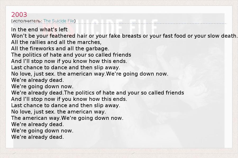 Это интересно:Группа появилась в 2001-ом году стараниями 2-ух экс-участников The Hope Conspiracy. Существовали всего два года, выпустили несколько релизов, но тем не менее оставили след в истории и полюбились многим, прежде всего за счет довольно оригинального звучания, отличной подачи на живых шоу и довольно простой но в то же время цепляющей и несущей i-am-pissed-off посыл лирики. После распада несколько раз переиздавали... продолжение