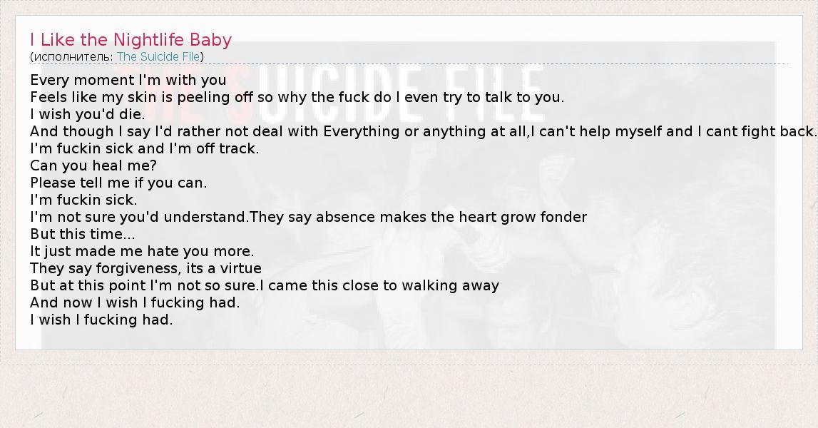 Every moment I'm with you Feels like my skin is peeling off so why the fuck do I even try to talk to you. I wish you'd die. And though I say I'd rather not deal with Everything or anything at all,I can't help myself and I cant fight back. I'm fuckin sick and I'm off track. Can you heal me? Please tell me if you can. I'm fuckin sick. I'm not sure you'd understand.They say absence makes the heart grow fonder But this time... It just made me hate you more. They say forgiveness, its a virtue But at this point I'm not so sure.I came this close to walking away And now I wish I fucking had. I wish I fucking had.