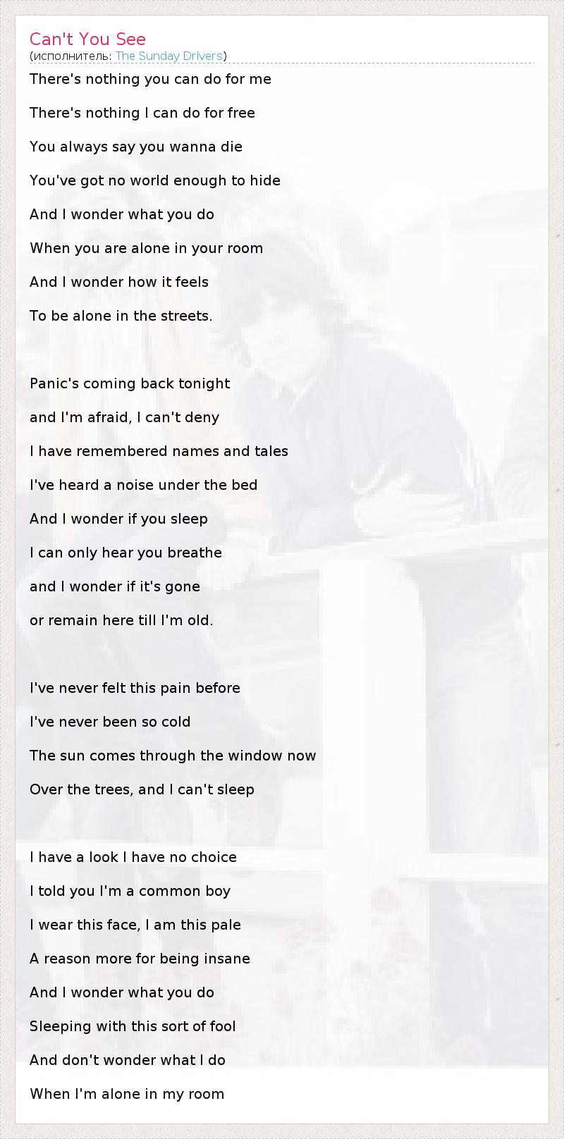 There's nothing you can do for me There's nothing I can do for free You always say you wanna die You've got no world enough to hide And I wonder what you do When you are alone in your room And I wonder how it feels To be alone in the streets. Panic's coming back tonight and I'm afraid, I can't deny I have remembered names and tales I've heard a noise under the bed And I wonder if you sleep I can only hear you breathe and I wonder if it's gone or remain here till I'm old. I've never felt this pain before I've never been so cold The sun comes through the window now Over the trees, and I can't sleep I have a look I have no choice I told you I'm a common boy I wear this face, I am this pale A reason more for being insane And I wonder what you do Sleeping with this sort of fool And don't wonder what I do When I'm alone in my room