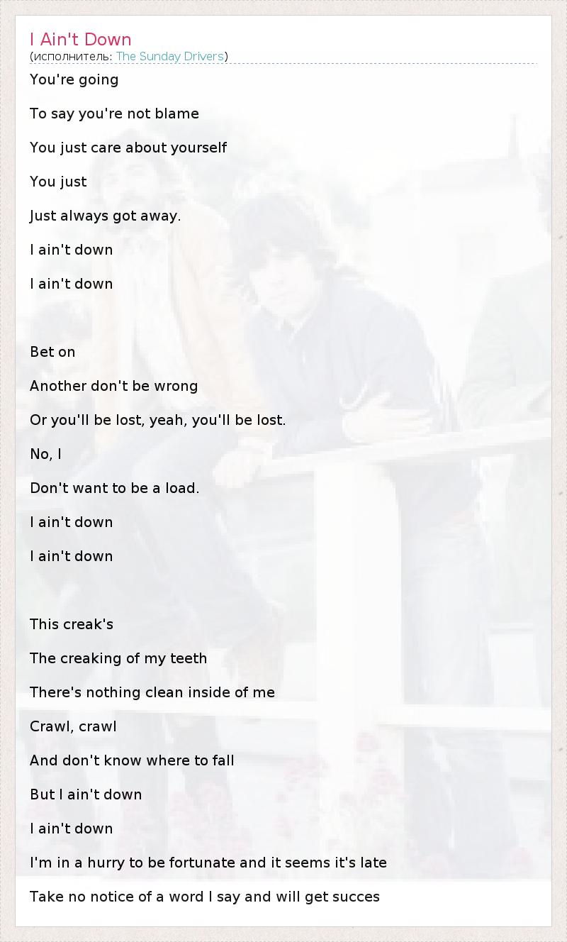 You're going To say you're not blame You just care about yourself You just Just always got away. I ain't down I ain't down Bet on Another don't be wrong Or you'll be lost, yeah, you'll be lost. No, I Don't want to be a load. I ain't down I ain't down This creak's The creaking of my teeth There's nothing clean inside of me Crawl, crawl And don't know where to fall But I ain't down I ain't down I'm in a hurry to be fortunate and it seems it's late Take no notice of a word I say and will get succes