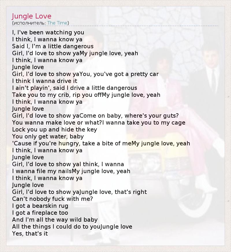 I, I've been watching you I think, I wanna know ya Said I, I'm a little dangerous Girl, I'd love to show yaMy jungle love, yeah I think, I wanna know ya Jungle love Girl, I'd love to show yaYou, you've got a pretty car I think I wanna drive it I ain't playin', said I drive a little dangerous Take you to my crib, rip you offMy jungle love, yeah I think, I wanna know ya Jungle love Girl, I'd love to show yaCome on baby, where's your guts? You wanna make love or what?I wanna take you to my cage Lock you up and hide the key You only get water, baby 'Cause if you're hungry, take a bite of meMy jungle love, yeah I think, I wanna know ya Jungle love Girl, I'd love to show yaI think, I wanna I wanna file my nailsMy jungle love, yeah I think, I wanna know ya Jungle love Girl, I'd love to show yaJungle love, that's right Can't nobody fuck with me? I got a bearskin rug I got a fireplace too And I'm all the way wild baby All the things I could do to youJungle love Yes, that's it