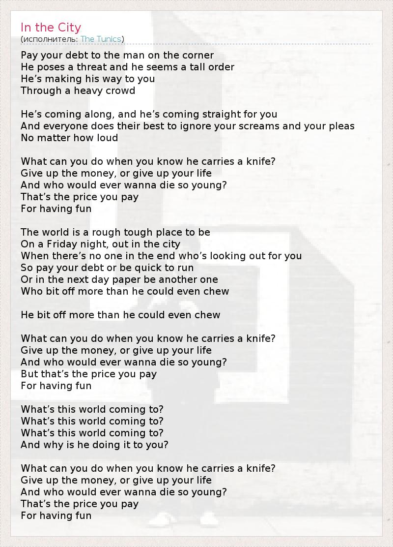 Pay your debt to the man on the corner He poses a threat and he seems a tall order He’s making his way to you Through a heavy crowd He’s coming along, and he’s coming straight for you And everyone does their best to ignore your screams and your pleas No matter how loud What can you do when you know he carries a knife? Give up the money, or give up your life And who would ever wanna die so young? That’s the price you pay For having fun The world is a rough tough place to be On a Friday night, out in the city When there’s no one in the end who’s looking out for you So pay your debt or be quick to run Or in the next day paper be another one Who bit off more than he could even chew He bit off more than he could even chew What can you do when you know he carries a knife? Give up the money, or give up your life And who would ever wanna die so young? But that’s the price you pay For having fun What’s this world coming to? What’s this world coming to? What’s this world coming to? And why is he doing it to you? What can you do when you know he carries a knife? Give up the money, or give up your life And who would ever wanna die so young? That’s the price you pay For having fun