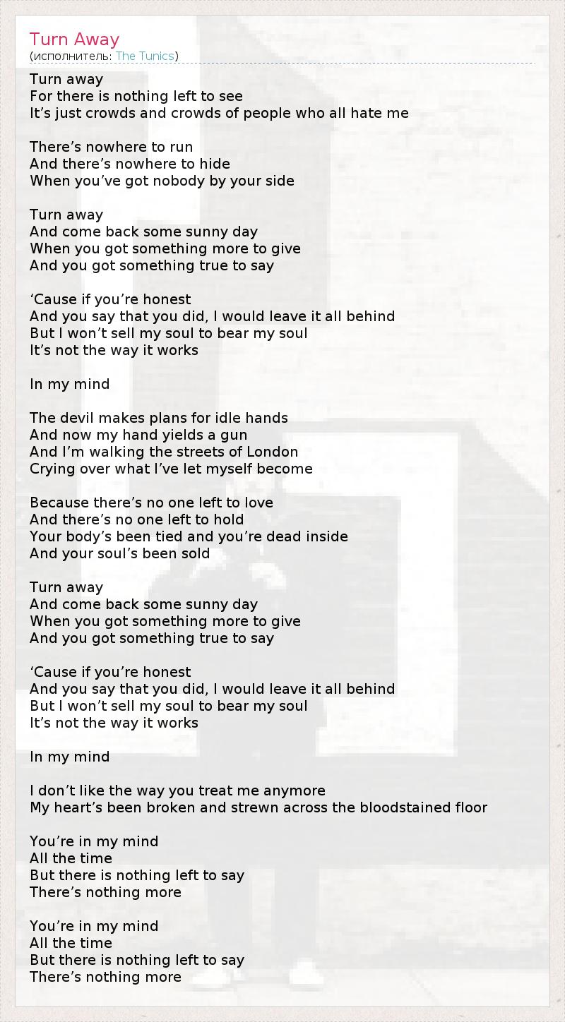 Это интересно:Если вы до потери сознания любите Arctic Monkeys, то группа The Tunics как раз для вас. Группа хоть и похожа на мартышек, но все же обладает индивидуальным звучанием, а уж музыкального задора и мальчишеского бунтарства им не занимать! The Tunics не копируют, а синтезируют и предлагают свой собственный вариант. Первым и пока единственным альбомом англичан из городка Кройдон (Большой Лондон) является "Somewhere... продолжение