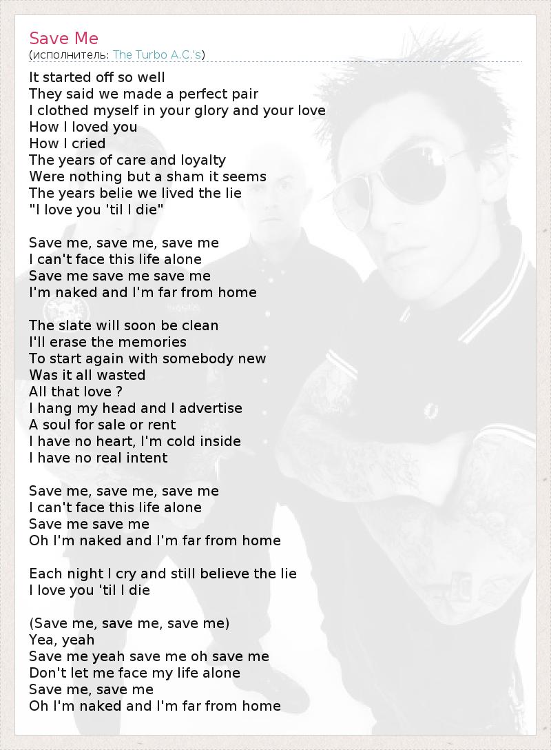 Все начиналось так хорошо. Все говорили, что мы отличная пара. Я укрылся твоим величием и твоей любовью. Как же я любил тебя... Как же я страдал... Годы заботы и верности, Кажется, были лишь притворством. Годы разоблачили ложь под названием "Я буду любить тебя до самой смерти" Спаси меня, спаси меня, спаси меня! Я не могу смело посмотреть в лицо жизни в одиночку, Спаси меня, спаси меня, спаси меня! Я совершенно беззащитен и так далеко от родного дома. Скоро список станет совершенно чистым... Я сотру воспоминания, Чтобы начать все сначала с новым человеком. Все было растрачено впустую? Вся эта любовь? Я совершенно повесил нос и дал объявление О продаже или сдаче в аренду своей души. У меня нет сердца, я холоден внутри, У меня нет реальной цели. Спаси меня, спаси меня, спаси меня! Я не могу смело посмотреть в лицо жизни в одиночку, Спаси меня, спаси меня! Я совершенно беззащитен и так далеко от родного дома. Каждую ночь я страдаю и до сих пор верю в ложь под названием "Я буду любить тебя до самой смерти" (Спаси меня, спаси меня, спаси меня!) Да, да... Спаси меня, спаси меня, спаси меня! Не дай мне столкнуться лицом к лицу со своей жизнью в одиночку! Спаси меня, спаси меня! Я совершенно беззащитен и так далеко от родного дома.