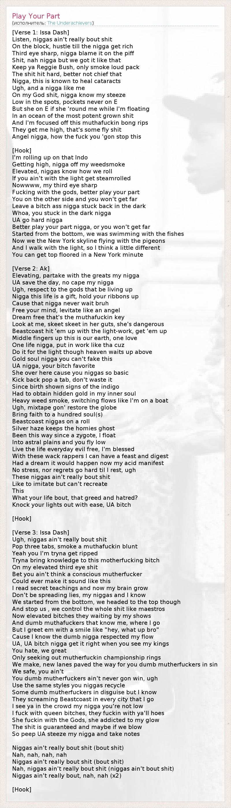 [Verse 1: Issa Dash] Listen, niggas ain't really bout shit On the block, hustle till the nigga get rich Third eye sharp, nigga blame it on the piff Shit, nah nigga but we got it like that Keep ya Reggie Bush, only smoke loud pack The shit hit hard, better not chief that Nigga, this is known to heal cataracts Ugh, and a nigga like me On my God shit, nigga know my steeze Low in the spots, pockets never on E But she on E if she 'round me while I'm floating In an ocean of the most potent grown shit And I'm focused off this muthafuckin bong rips They get me high, that's some fly shit Angel nigga, how the fuck you 'gon stop this [Hook] I'm rolling up on that Indo Getting high, nigga off my weedsmoke Elevated, niggas know how we roll If you ain't with the light get steamrolled Nowwww, my third eye sharp Fucking with the gods, better play your part You on the other side and you won't get far Leave a bitch ass nigga stuck back in the dark Whoa, you stuck in the dark nigga UA go hard nigga Better play your part nigga, or you won't get far Started from the bottom, we was swimming with the fishes Now we the New York skyline flying with the pigeons And I walk with the light, so I think a little different You can get top floored in a New York minute [Verse 2: Ak] Elevating, partake with the greats my nigga UA save the day, no cape my nigga Ugh, respect to the gods that be living up Nigga this life is a gift, hold your ribbons up Cause that nigga never wait bruh Free your mind, levitate like an angel Dream free that's the muthafuckin key Look at me, skeet skeet in her guts, she's dangerous Beastcoast hit 'em up with the light-work, get 'em up Middle fingers up this is our earth, one love One life nigga, put in work like tha cuz Do it for the light though heaven waits up above Gold soul nigga you can't fake this UA nigga, your bitch favorite She over here cause you niggas so basic Kick back pop a tab, don't waste it Since birth shown signs of the indigo Had to obtain hidden gold in my inner soul Heavy weed smoke, switching flows like I'm on a boat Ugh, mixtape gon' restore the globe Bring faith to a hundred soul(s) Beastcoast niggas on a roll Silver haze keeps the homies ghost Been this way since a zygote, I float Into astral plains and you fly low Live the life everyday evil free, I'm blessed With these wack rappers I can have a feast and digest Had a dream it would happen now my acid manifest No stress, nor regrets go hard til I rest, ugh These niggas ain't really bout shit Like to imitate but can't recreate This What your life bout, that greed and hatred? Knock your lights out with ease, UA bitch [Hook] [Verse 3: Issa Dash] Ugh, niggas ain't really bout shit Pop three tabs, smoke a muthafuckin blunt Yeah you I'm tryna get ripped Tryna bring knowledge to this motherfucking bitch On my elevated third eye shit Bet you ain't think a conscious mutherfucker Could ever make it sound like this I read secret teachings and now my brain grow Don't be spreading lies, my niggas and I know We started from the bottom, we headed to the top though And stop us , we control the whole shit like maestros Now elevated bitches they waiting by my shows And dumb muthafuckers that know me, where I go But I greet em with a smile like "hey, what up bro" Cause I know the dumb nigga respected my flow UA, UA bitch nigga get it right when you see my kings You hate, we great Only seeking out mutherfuckin championship rings We make, new lanes paved the way for you dumb mutherfuckers in sin We safe, you ain't You dumb mutherfuckers ain't never gon win, ugh Use the same styles you niggas recycle Some dumb mutherfuckers in disguise but I know They screaming Beastcoast in every city that I go I see ya in the crowd my nigga you're not low I fuck with queen bitches, they fuckin with ya'll hoes She fuckin with the Gods, she addicted to my glow The shit is guaranteed and maybe if we blow So peep UA steeze my nigga and take notes Niggas ain't really bout shit (bout shit) Nah, nah, nah, nah Niggas ain't really bout shit (bout shit) Nah, niggas ain't really bout shit (niggas ain't bout shit) Niggas ain't really bout, nah, nah (x2) [Hook]
