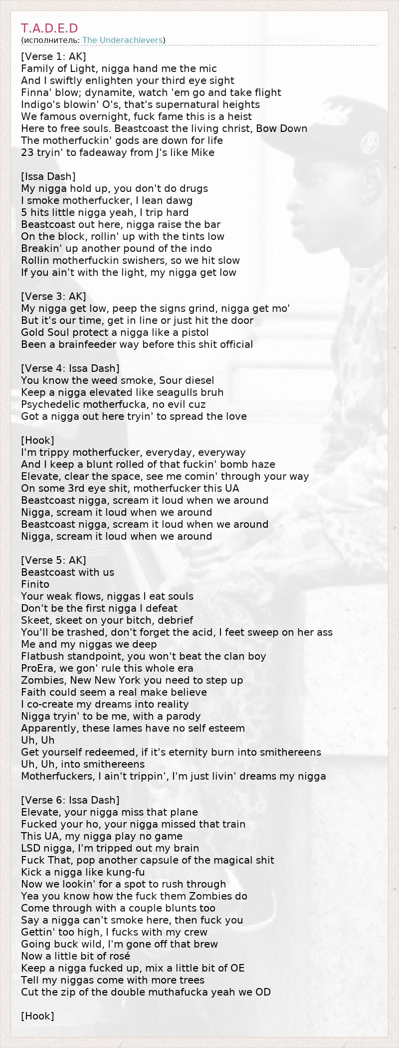 [Verse 1: AK] Family of Light, nigga hand me the mic And I swiftly enlighten your third eye sight Finna' blow; dynamite, watch 'em go and take flight Indigo's blowin' O's, that's supernatural heights We famous overnight, fuck fame this is a heist Here to free souls. Beastcoast the living christ, Bow Down The motherfuckin' gods are down for life 23 tryin' to fadeaway from J's like Mike [Issa Dash] My nigga hold up, you don't do drugs I smoke motherfucker, I lean dawg 5 hits little nigga yeah, I trip hard Beastcoast out here, nigga raise the bar On the block, rollin' up with the tints low Breakin' up another pound of the indo Rollin motherfuckin swishers, so we hit slow If you ain't with the light, my nigga get low [Verse 3: AK] My nigga get low, peep the signs grind, nigga get mo' But it's our time, get in line or just hit the door Gold Soul protect a nigga like a pistol Been a brainfeeder way before this shit official [Verse 4: Issa Dash] You know the weed smoke, Sour diesel Keep a nigga elevated like seagulls bruh Psychedelic motherfucka, no evil cuz Got a nigga out here tryin' to spread the love [Hook] I'm trippy motherfucker, everyday, everyway And I keep a blunt rolled of that fuckin' bomb haze Elevate, clear the space, see me comin' through your way On some 3rd eye shit, motherfucker this UA Beastcoast nigga, scream it loud when we around Nigga, scream it loud when we around Beastcoast nigga, scream it loud when we around Nigga, scream it loud when we around [Verse 5: AK] Beastcoast with us Finito Your weak flows, niggas I eat souls Don't be the first nigga I defeat Skeet, skeet on your bitch, debrief You'll be trashed, don't forget the acid, I feet sweep on her ass Me and my niggas we deep Flatbush standpoint, you won't beat the clan boy ProEra, we gon' rule this whole era Zombies, New New York you need to step up Faith could seem a real make believe I co-create my dreams into reality Nigga tryin' to be me, with a parody Apparently, these lames have no self esteem Uh, Uh Get yourself redeemed, if it's eternity burn into smithereens Uh, Uh, into smithereens Motherfuckers, I ain't trippin', I'm just livin' dreams my nigga [Verse 6: Issa Dash] Elevate, your nigga miss that plane Fucked your ho, your nigga missed that train This UA, my nigga play no game LSD nigga, I'm tripped out my brain Fuck That, pop another capsule of the magical shit Kick a nigga like kung-fu Now we lookin' for a spot to rush through Yea you know how the fuck them Zombies do Come through with a couple blunts too Say a nigga can't smoke here, then fuck you Gettin' too high, I fucks with my crew Going buck wild, I'm gone off that brew Now a little bit of rosé Keep a nigga fucked up, mix a little bit of OE Tell my niggas come with more trees Cut the zip of the double muthafucka yeah we OD [Hook]