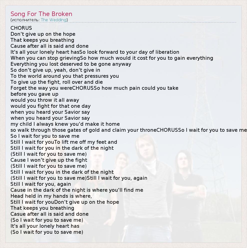 CHORUS Don't give up on the hope That keeps you breathing Cause after all is said and done It's all your lonely heart hasSo look forward to your day of liberation When you can stop grievingSo how much would it cost for you to gain everything Everything you lost deserved to be gone anyway So don't give up, yeah, don't give in To the world around you that pressures you To give up the fight, roll over and die Forget the way you wereCHORUSSo how much pain could you take before you gave up would you throw it all away would you fight for that one day when you heard your Savior say when you heard your Savior say my child I always knew you'd make it home so walk through those gates of gold and claim your throneCHORUSSo I wait for you to save me So I wait for you to save me Still I wait for youTo lift me off my feet and Still I wait for you in the dark of the night (Still I wait for you to save me) Cause I won't give up the fight (Still I wait for you to save me) Still I wait for you in the dark of the night (Still I wait for you to save me)Still I wait for you, again Still I wait for you, again Cause in the dark of the night is where you'll find me Head held in my hands is where, Still I wait for youDon't give up on the hope That keeps you breathing Casue after all is said and done (So I wait for you to save me) It's all your lonely heart has (So I wait for you to save me)