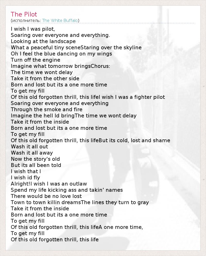I wish I was pilot, Soaring over everyone and everything. Looking at the landscape What a peaceful tiny sceneStaring over the skyline Oh I feel the blue dancing on my wings Turn off the engine Imagine what tomorrow bringsChorus: The time we wont delay Take it from the other side Born and lost but its a one more time To get my fill Of this old forgotten thrill, this lifeI wish I was a fighter pilot Soaring over everyone and everything Through the smoke and fire Imagine the hell Id bringThe time we wont delay Take it from the inside Born and lost but its a one more time To get my fill Of this old forgotten thrill, this lifeBut its cold, lost and shame Wash it all out Wash it all away Now the story's old But its all been told I wish that I I wish id fly Alright!I wish I was an outlaw Spend my life kicking ass and takin' names There would be no love lost Town to town killin dreamsThe lines they turn to gray Take it from the inside Born and lost but its a one more time To get my fill Of this old forgotten thrill, this lifeA one more time, To get my fill Of this old forgotten thrill, this life