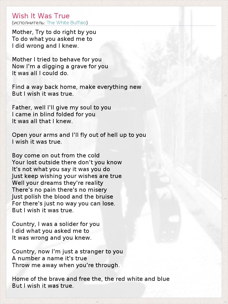 Mother, Try to do right by you To do what you asked me to I did wrong and I knew. Mother I tried to behave for you Now I'm a digging a grave for you It was all I could do. Find a way back home, make everything new But I wish it was true. Father, well I'll give my soul to you I came in blind folded for you It was all that I knew. Open your arms and I'll fly out of hell up to you I wish it was true. Boy come on out from the cold Your lost outside there don't you know It's not what you say it was you do Just keep wishing your wishes are true Well your dreams they're reality There's no pain there's no misery Just polish the blood and the bruise For there's just no way you can lose. But I wish it was true. Country, I was a solider for you I did what you asked me to It was wrong and you knew. Country, now I'm just a stranger to you A number a name it's true Throw me away when you're through. Home of the brave and free the, the red white and blue But I wish it was true.