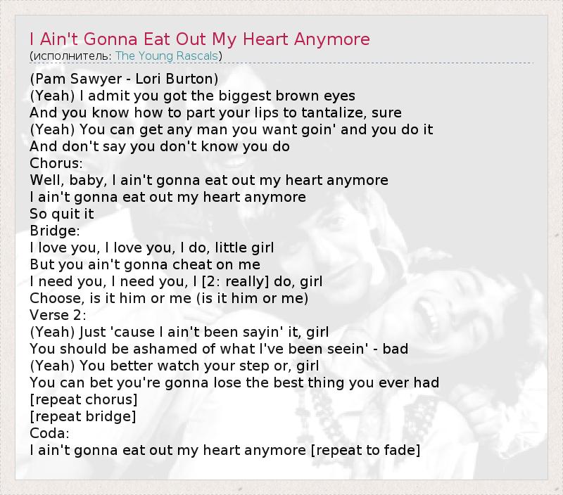 (Pam Sawyer - Lori Burton) (Yeah) I admit you got the biggest brown eyes And you know how to part your lips to tantalize, sure (Yeah) You can get any man you want goin' and you do it And don't say you don't know you do Chorus: Well, baby, I ain't gonna eat out my heart anymore I ain't gonna eat out my heart anymore So quit it Bridge: I love you, I love you, I do, little girl But you ain't gonna cheat on me I need you, I need you, I [2: really] do, girl Choose, is it him or me (is it him or me) Verse 2: (Yeah) Just 'cause I ain't been sayin' it, girl You should be ashamed of what I've been seein' - bad (Yeah) You better watch your step or, girl You can bet you're gonna lose the best thing you ever had [repeat chorus] [repeat bridge] Coda: I ain't gonna eat out my heart anymore [repeat to fade]