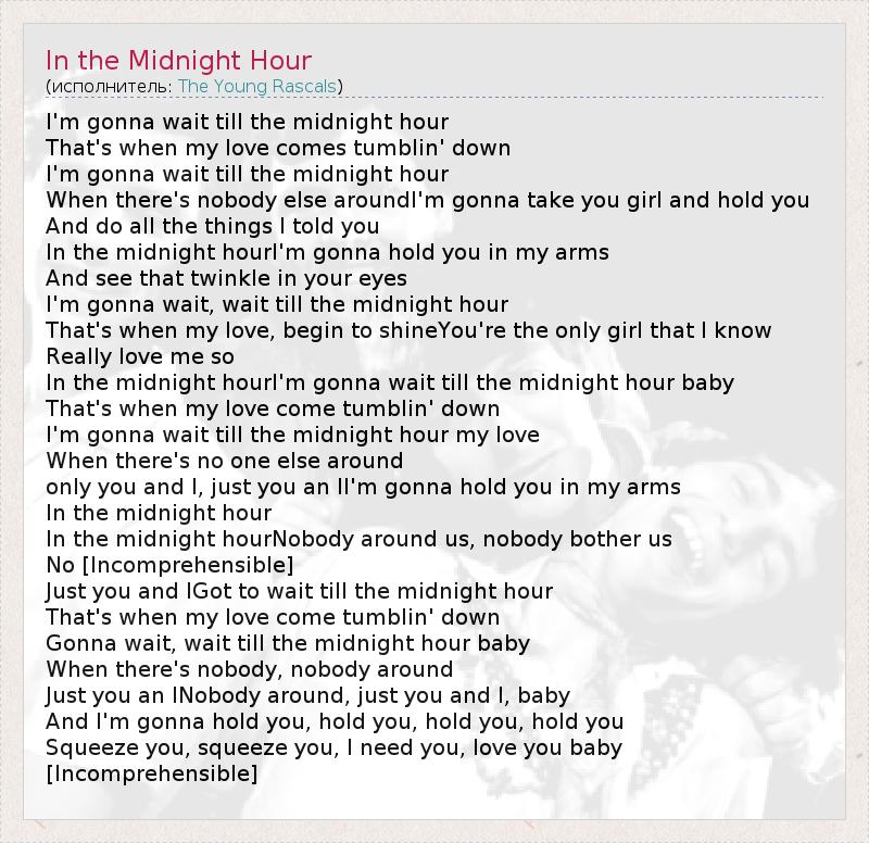 I'm gonna wait till the midnight hour That's when my love comes tumblin' down I'm gonna wait till the midnight hour When there's nobody else aroundI'm gonna take you girl and hold you And do all the things I told you In the midnight hourI'm gonna hold you in my arms And see that twinkle in your eyes I'm gonna wait, wait till the midnight hour That's when my love, begin to shineYou're the only girl that I know Really love me so In the midnight hourI'm gonna wait till the midnight hour baby That's when my love come tumblin' down I'm gonna wait till the midnight hour my love When there's no one else around only you and I, just you an II'm gonna hold you in my arms In the midnight hour In the midnight hourNobody around us, nobody bother us No [Incomprehensible] Just you and IGot to wait till the midnight hour That's when my love come tumblin' down Gonna wait, wait till the midnight hour baby When there's nobody, nobody around Just you an INobody around, just you and I, baby And I'm gonna hold you, hold you, hold you, hold you Squeeze you, squeeze you, I need you, love you baby [Incomprehensible]