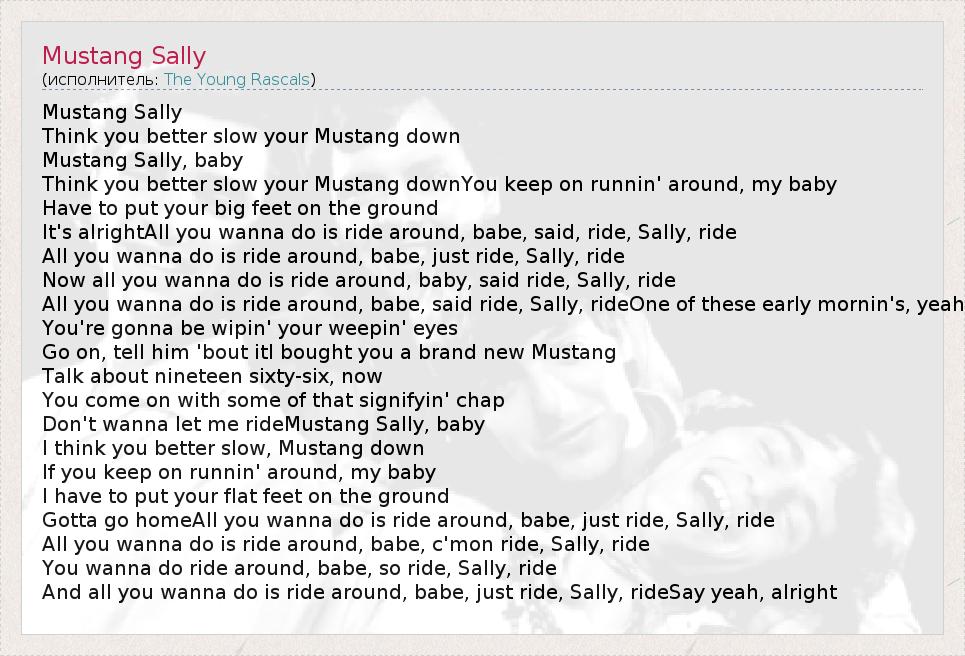 Mustang Sally Think you better slow your Mustang down Mustang Sally, baby Think you better slow your Mustang downYou keep on runnin' around, my baby Have to put your big feet on the ground It's alrightAll you wanna do is ride around, babe, said, ride, Sally, ride All you wanna do is ride around, babe, just ride, Sally, ride Now all you wanna do is ride around, baby, said ride, Sally, ride All you wanna do is ride around, babe, said ride, Sally, rideOne of these early mornin's, yeah You're gonna be wipin' your weepin' eyes Go on, tell him 'bout itI bought you a brand new Mustang Talk about nineteen sixty-six, now You come on with some of that signifyin' chap Don't wanna let me rideMustang Sally, baby I think you better slow, Mustang down If you keep on runnin' around, my baby I have to put your flat feet on the ground Gotta go homeAll you wanna do is ride around, babe, just ride, Sally, ride All you wanna do is ride around, babe, c'mon ride, Sally, ride You wanna do ride around, babe, so ride, Sally, ride And all you wanna do is ride around, babe, just ride, Sally, rideSay yeah, alright
