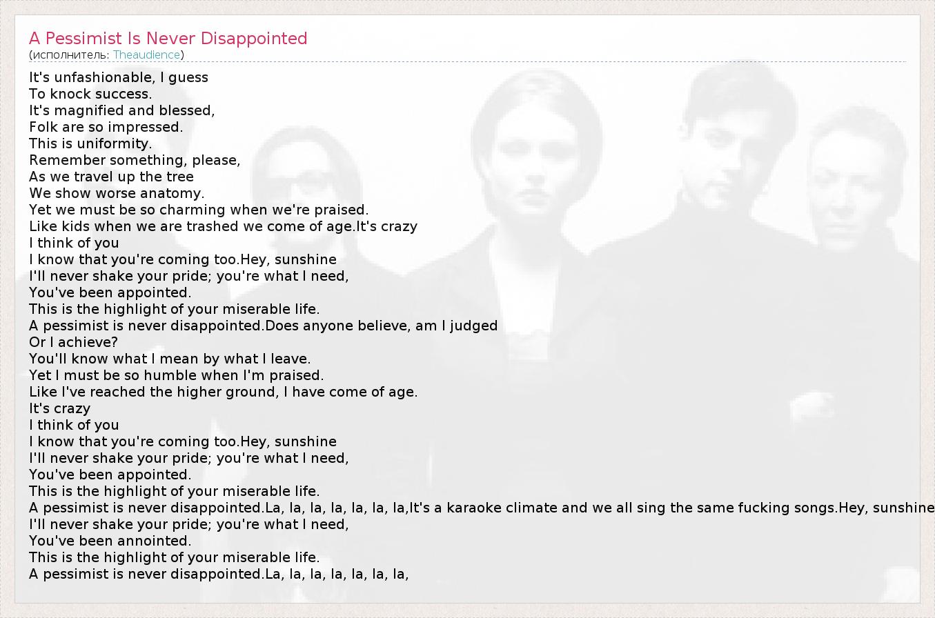 ГлавнаяИсполнителиTheaudienceA Pessimist Is Never Disappointed