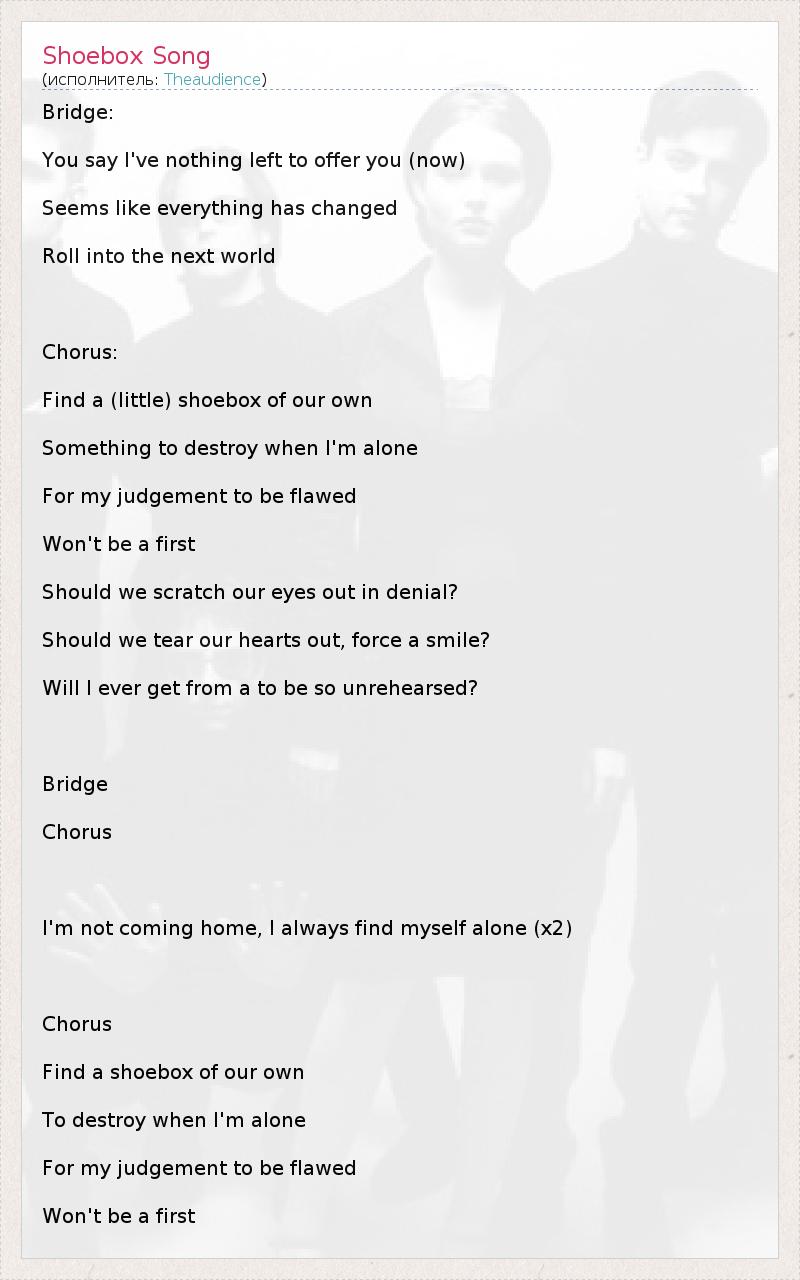 Bridge: You say I've nothing left to offer you (now) Seems like everything has changed Roll into the next world Chorus: Find a (little) shoebox of our own Something to destroy when I'm alone For my judgement to be flawed Won't be a first Should we scratch our eyes out in denial? Should we tear our hearts out, force a smile? Will I ever get from a to be so unrehearsed? Bridge Chorus I'm not coming home, I always find myself alone (x2) Chorus Find a shoebox of our own To destroy when I'm alone For my judgement to be flawed Won't be a first
