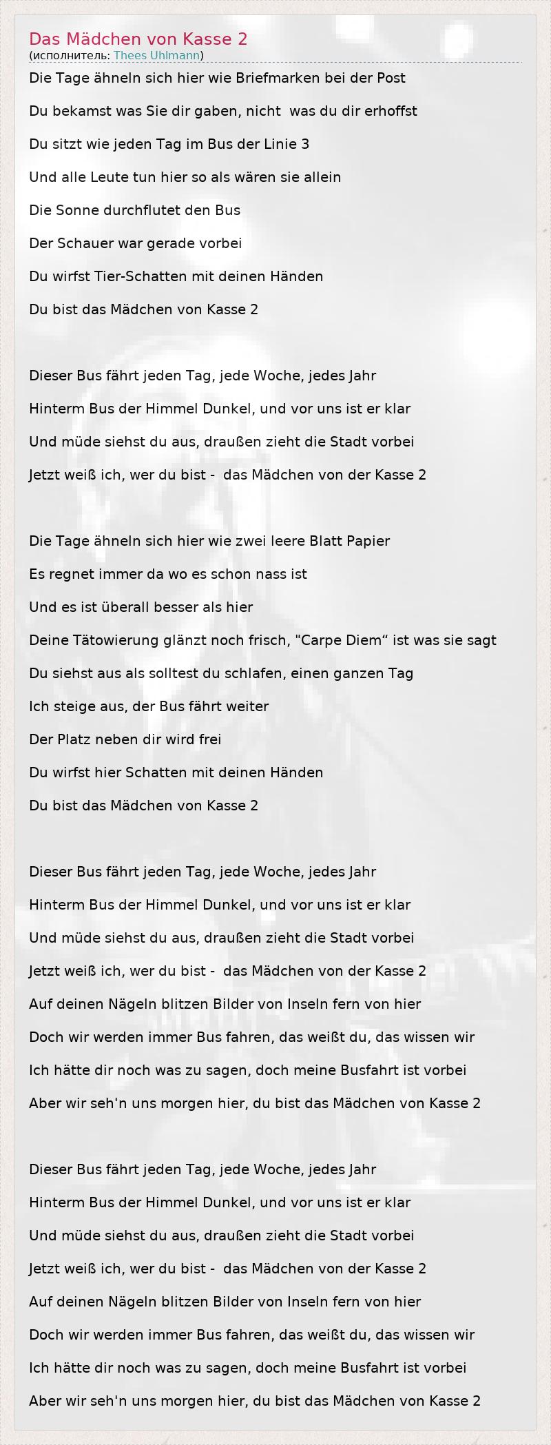 А как ты думаешь, о чем песня "Das Mädchen von Kasse 2" ?