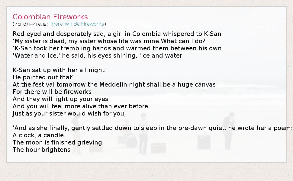 А как ты думаешь, о чем песня "Colombian Fireworks" ?