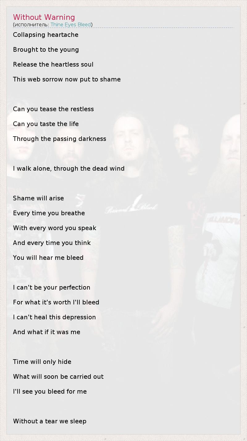 Collapsing heartache Brought to the young Release the heartless soul This web sorrow now put to shame Can you tease the restless Can you taste the life Through the passing darkness I walk alone, through the dead wind Shame will arise Every time you breathe With every word you speak And every time you think You will hear me bleed I can't be your perfection For what it's worth I'll bleed I can't heal this depression And what if it was me Time will only hide What will soon be carried out I'll see you bleed for me Without a tear we sleep