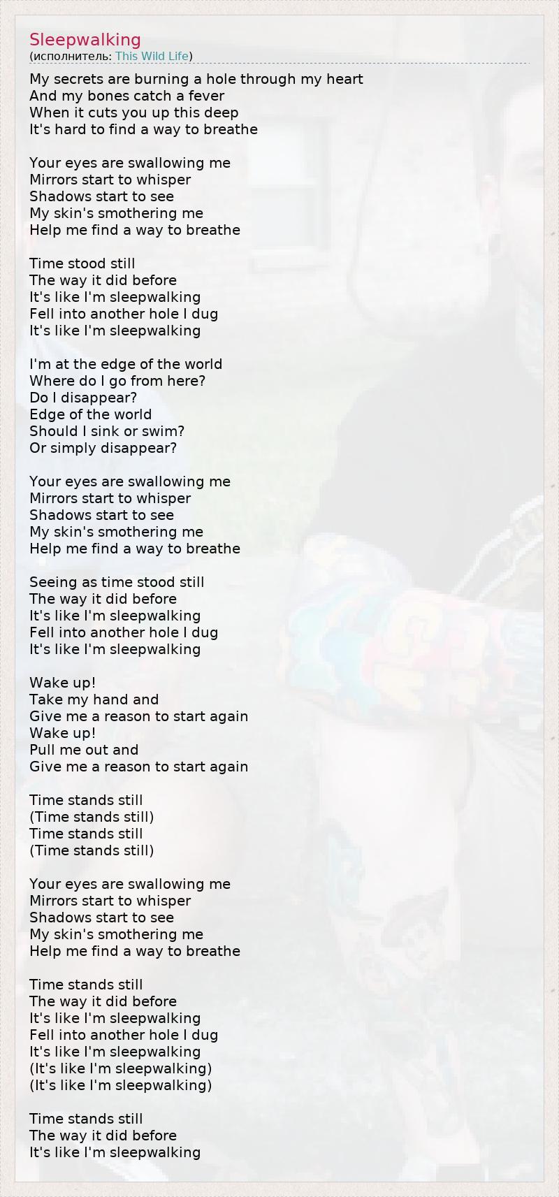 Мои секреты прожигают моё сердце насквозь, Мои кости ломит. Когда режет так глубоко, Трудно найти способ дышать Твои глаза проглатывают меня, Зеркала начинают шептать, Тени начинают видеть, Моя кожа душит меня, Помоги мне дышать. Время остановилось Так же, как и раньше; Кажется, что я хожу во сне. Я упал в ещё одну яму, которую выкопал, Кажется, что я хожу во сне Я на краю мира. Куда мне идти отсюда? Исчезну ли я? Край мира... Я должен тонуть или плыть? Или просто исчезнуть? Твои глаза проглатывают меня, Зеркала начинают шептать, Тени начинают видеть, Моя кожа душит меня, Помоги мне дышать. Вижу, как время остановилось Так же, как раньше; Кажется, что я хожу во сне. Я упал в ещё одну яму, которую выкопал, Кажется, что я хожу во сне Проснись! Возьми меня за руку и Дай мне повод начать заново. Проснись! Вытащи меня и Дай мне повод начать заново. Время остановилось... Время остановилось... Время остановилось... Время остановилось... Твои глаза проглатывают меня, Зеркала начинают шептать, Тени начинают видеть, Моя кожа душит меня, Помоги мне дышать. Время остановилось Так же, как и раньше; Кажется, что я хожу во сне. Я упал в ещё одну яму, которую выкопал, Кажется, что я хожу во сне. (Кажется, что я хожу во сне) (Кажется, что я хожу во сне) Время остановилось Так же, как и раньше; Кажется, что я хожу во сне.
