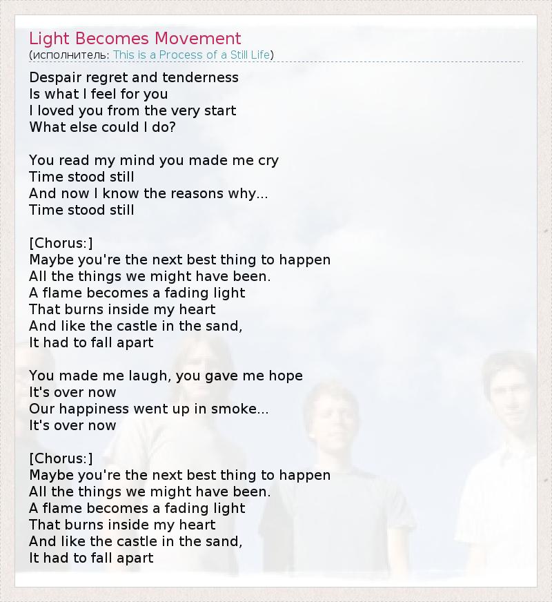 Despair regret and tenderness Is what I feel for you I loved you from the very start What else could I do? You read my mind you made me cry Time stood still And now I know the reasons why... Time stood still [Chorus:] Maybe you're the next best thing to happen All the things we might have been. A flame becomes a fading light That burns inside my heart And like the castle in the sand, It had to fall apart You made me laugh, you gave me hope It's over now Our happiness went up in smoke... It's over now [Chorus:] Maybe you're the next best thing to happen All the things we might have been. A flame becomes a fading light That burns inside my heart And like the castle in the sand, It had to fall apart