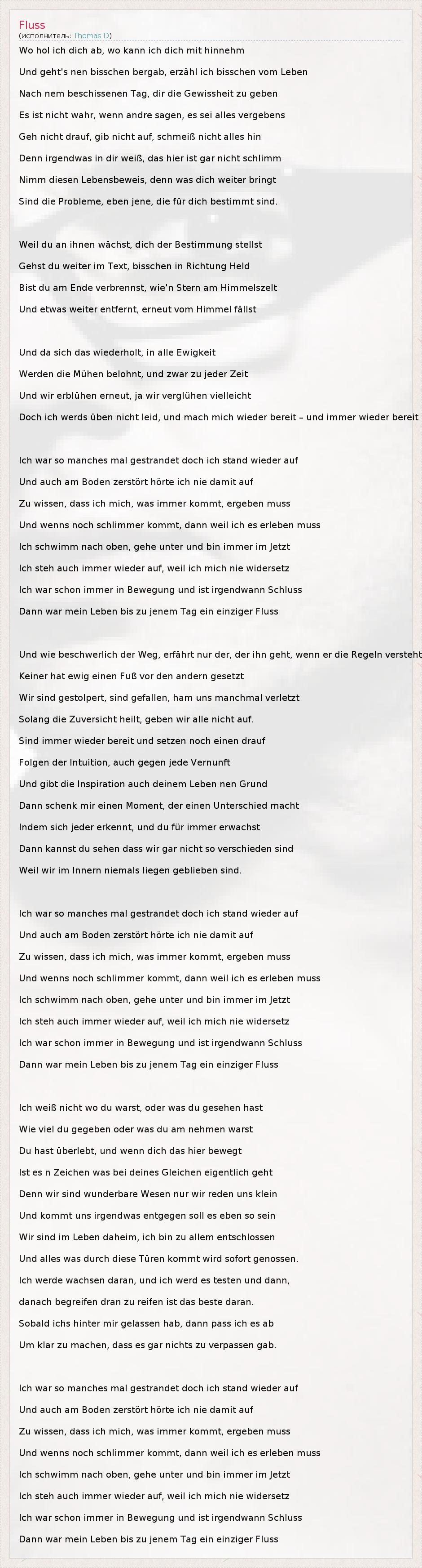 Wo hol ich dich ab, wo kann ich dich mit hinnehm Und geht's nen bisschen bergab, erzähl ich bisschen vom Leben Nach nem beschissenen Tag, dir die Gewissheit zu geben Es ist nicht wahr, wenn andre sagen, es sei alles vergebens Geh nicht drauf, gib nicht auf, schmeiß nicht alles hin Denn irgendwas in dir weiß, das hier ist gar nicht schlimm Nimm diesen Lebensbeweis, denn was dich weiter bringt Sind die Probleme, eben jene, die für dich bestimmt sind. Weil du an ihnen wächst, dich der Bestimmung stellst Gehst du weiter im Text, bisschen in Richtung Held Bist du am Ende verbrennst, wie'n Stern am Himmelszelt Und etwas weiter entfernt, erneut vom Himmel fällst Und da sich das wiederholt, in alle Ewigkeit Werden die Mühen belohnt, und zwar zu jeder Zeit Und wir erblühen erneut, ja wir verglühen vielleicht Doch ich werds üben nicht leid, und mach mich wieder bereit – und immer wieder bereit Ich war so manches mal gestrandet doch ich stand wieder auf Und auch am Boden zerstört hörte ich nie damit auf Zu wissen, dass ich mich, was immer kommt, ergeben muss Und wenns noch schlimmer kommt, dann weil ich es erleben muss Ich schwimm nach oben, gehe unter und bin immer im Jetzt Ich steh auch immer wieder auf, weil ich mich nie widersetz Ich war schon immer in Bewegung und ist irgendwann Schluss Dann war mein Leben bis zu jenem Tag ein einziger Fluss Und wie beschwerlich der Weg, erfährt nur der, der ihn geht, wenn er die Regeln versteht Keiner hat ewig einen Fuß vor den andern gesetzt Wir sind gestolpert, sind gefallen, ham uns manchmal verletzt Solang die Zuversicht heilt, geben wir alle nicht auf. Sind immer wieder bereit und setzen noch einen drauf Folgen der Intuition, auch gegen jede Vernunft Und gibt die Inspiration auch deinem Leben nen Grund Dann schenk mir einen Moment, der einen Unterschied macht Indem sich jeder erkennt, und du für immer erwachst Dann kannst du sehen dass wir gar nicht so verschieden sind Weil wir im Innern niemals liegen geblieben sind. Ich war so manches mal gestrandet doch ich stand wieder auf Und auch am Boden zerstört hörte ich nie damit auf Zu wissen, dass ich mich, was immer kommt, ergeben muss Und wenns noch schlimmer kommt, dann weil ich es erleben muss Ich schwimm nach oben, gehe unter und bin immer im Jetzt Ich steh auch immer wieder auf, weil ich mich nie widersetz Ich war schon immer in Bewegung und ist irgendwann Schluss Dann war mein Leben bis zu jenem Tag ein einziger Fluss Ich weiß nicht wo du warst, oder was du gesehen hast Wie viel du gegeben oder was du am nehmen warst Du hast überlebt, und wenn dich das hier bewegt Ist es n Zeichen was bei deines Gleichen eigentlich geht Denn wir sind wunderbare Wesen nur wir reden uns klein Und kommt uns irgendwas entgegen soll es eben so sein Wir sind im Leben daheim, ich bin zu allem entschlossen Und alles was durch diese Türen kommt wird sofort genossen. Ich werde wachsen daran, und ich werd es testen und dann, danach begreifen dran zu reifen ist das beste daran. Sobald ichs hinter mir gelassen hab, dann pass ich es ab Um klar zu machen, dass es gar nichts zu verpassen gab. Ich war so manches mal gestrandet doch ich stand wieder auf Und auch am Boden zerstört hörte ich nie damit auf Zu wissen, dass ich mich, was immer kommt, ergeben muss Und wenns noch schlimmer kommt, dann weil ich es erleben muss Ich schwimm nach oben, gehe unter und bin immer im Jetzt Ich steh auch immer wieder auf, weil ich mich nie widersetz Ich war schon immer in Bewegung und ist irgendwann Schluss Dann war mein Leben bis zu jenem Tag ein einziger Fluss