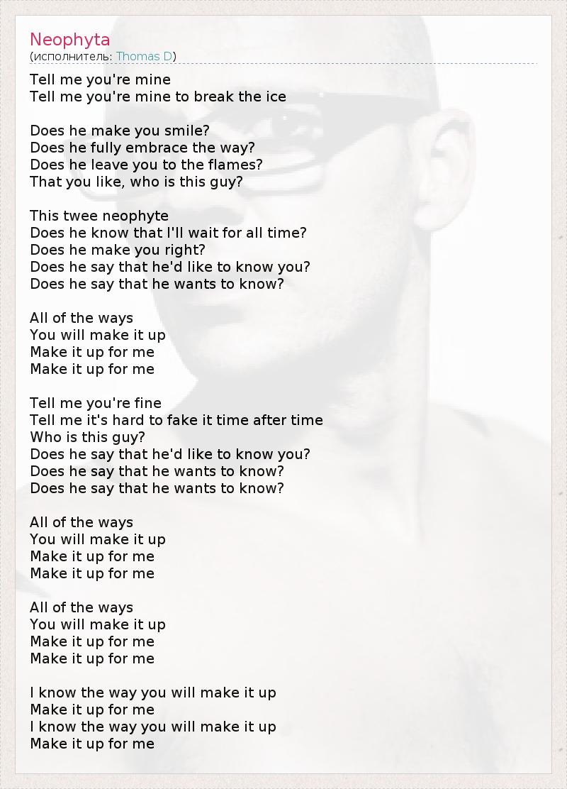Tell me you're mine Tell me you're mine to break the ice Does he make you smile? Does he fully embrace the way? Does he leave you to the flames? That you like, who is this guy? This twee neophyte Does he know that I'll wait for all time? Does he make you right? Does he say that he'd like to know you? Does he say that he wants to know? All of the ways You will make it up Make it up for me Make it up for me Tell me you're fine Tell me it's hard to fake it time after time Who is this guy? Does he say that he'd like to know you? Does he say that he wants to know? Does he say that he wants to know? All of the ways You will make it up Make it up for me Make it up for me All of the ways You will make it up Make it up for me Make it up for me I know the way you will make it up Make it up for me I know the way you will make it up Make it up for me