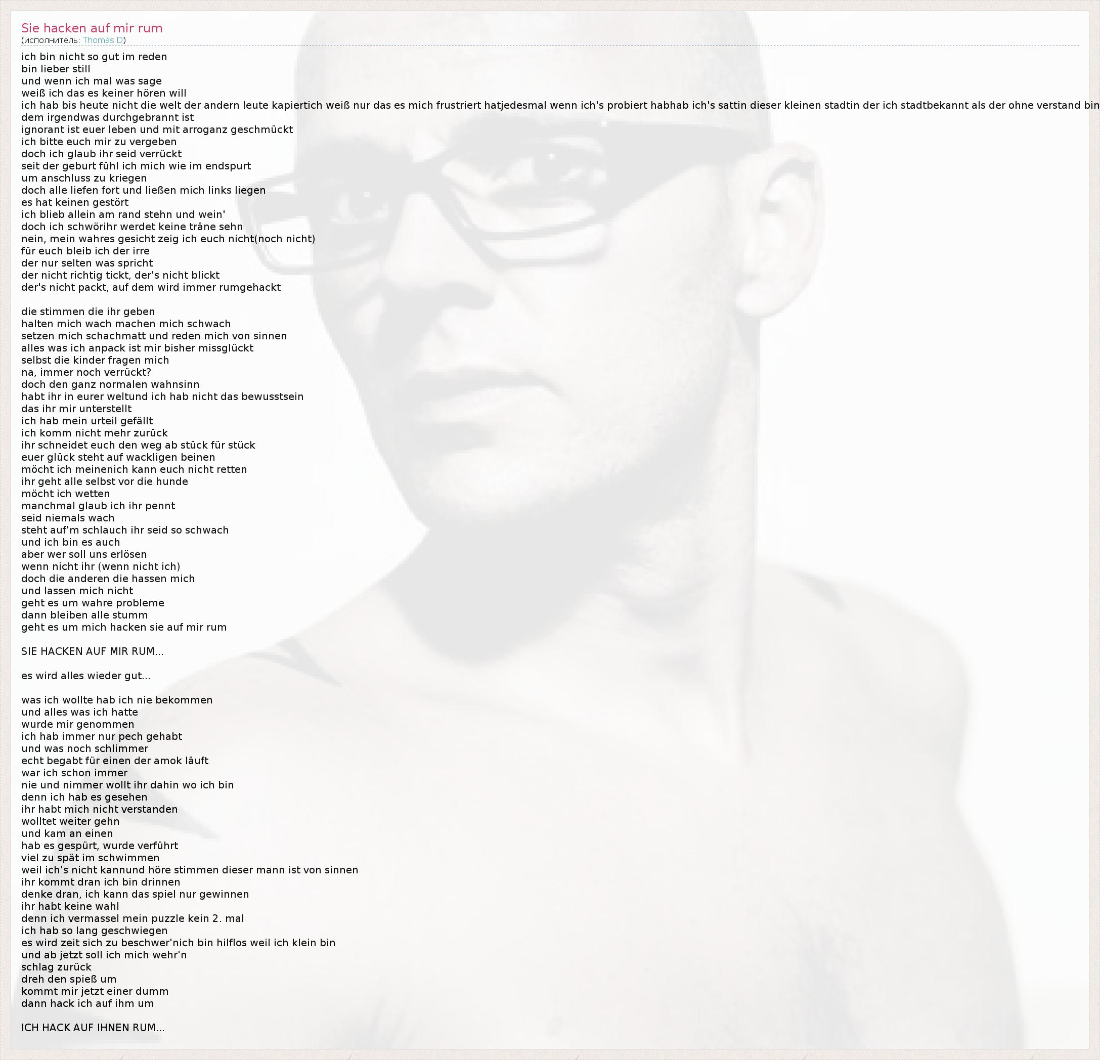 ich bin nicht so gut im reden bin lieber still und wenn ich mal was sage weiß ich das es keiner hören will ich hab bis heute nicht die welt der andern leute kapiertich weiß nur das es mich frustriert hatjedesmal wenn ich's probiert habhab ich's sattin dieser kleinen stadtin der ich stadtbekannt als der ohne verstand bin dem irgendwas durchgebrannt ist ignorant ist euer leben und mit arroganz geschmückt ich bitte euch mir zu vergeben doch ich glaub ihr seid verrückt seit der geburt fühl ich mich wie im endspurt um anschluss zu kriegen doch alle liefen fort und ließen mich links liegen es hat keinen gestört ich blieb allein am rand stehn und wein' doch ich schwörihr werdet keine träne sehn nein, mein wahres gesicht zeig ich euch nicht(noch nicht) für euch bleib ich der irre der nur selten was spricht der nicht richtig tickt, der's nicht blickt der's nicht packt, auf dem wird immer rumgehackt die stimmen die ihr geben halten mich wach machen mich schwach setzen mich schachmatt und reden mich von sinnen alles was ich anpack ist mir bisher missglückt selbst die kinder fragen mich na, immer noch verrückt? doch den ganz normalen wahnsinn habt ihr in eurer weltund ich hab nicht das bewusstsein das ihr mir unterstellt ich hab mein urteil gefällt ich komm nicht mehr zurück ihr schneidet euch den weg ab stück für stück euer glück steht auf wackligen beinen möcht ich meinenich kann euch nicht retten ihr geht alle selbst vor die hunde möcht ich wetten manchmal glaub ich ihr pennt seid niemals wach steht auf'm schlauch ihr seid so schwach und ich bin es auch aber wer soll uns erlösen wenn nicht ihr (wenn nicht ich) doch die anderen die hassen mich und lassen mich nicht geht es um wahre probleme dann bleiben alle stumm geht es um mich hacken sie auf mir rum SIE HACKEN AUF MIR RUM... es wird alles wieder gut... was ich wollte hab ich nie bekommen und alles was ich hatte wurde mir genommen ich hab immer nur pech gehabt und was noch schlimmer echt begabt für einen der amok läuft war ich schon immer nie und nimmer wollt ihr dahin wo ich bin denn ich hab es gesehen ihr habt mich nicht verstanden wolltet weiter gehn und kam an einen hab es gespürt, wurde verführt viel zu spät im schwimmen weil ich's nicht kannund höre stimmen dieser mann ist von sinnen ihr kommt dran ich bin drinnen denke dran, ich kann das spiel nur gewinnen ihr habt keine wahl denn ich vermassel mein puzzle kein 2. mal ich hab so lang geschwiegen es wird zeit sich zu beschwer'nich bin hilflos weil ich klein bin und ab jetzt soll ich mich wehr'n schlag zurück dreh den spieß um kommt mir jetzt einer dumm dann hack ich auf ihm um ICH HACK AUF IHNEN RUM...